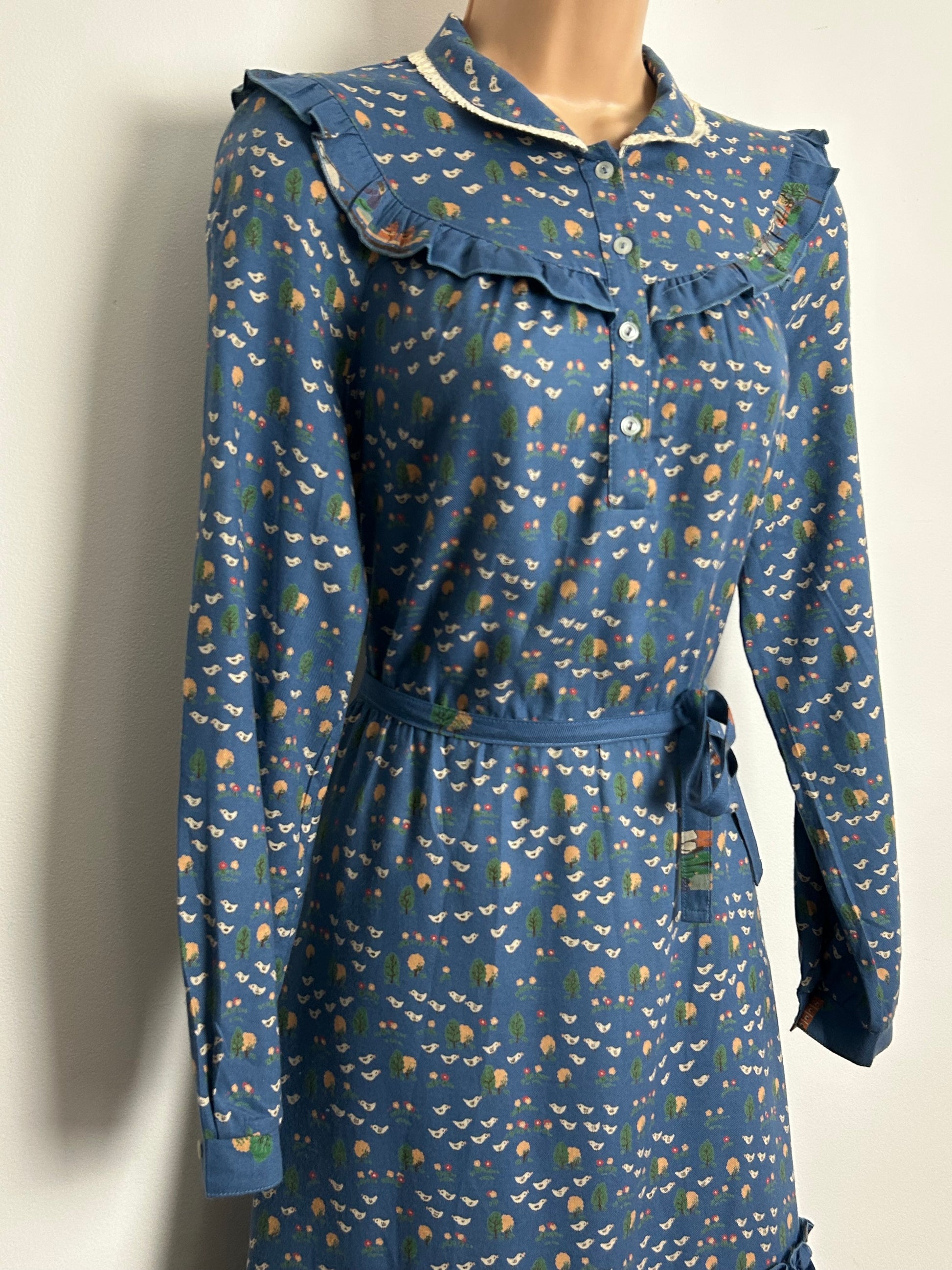 This cute little vintage day dress is made from 50% cotton & 50% modal in dusky blue. The dress is primarily a duck and tree print. With a countryside & farmyard print around the tiered part of the skirt.
