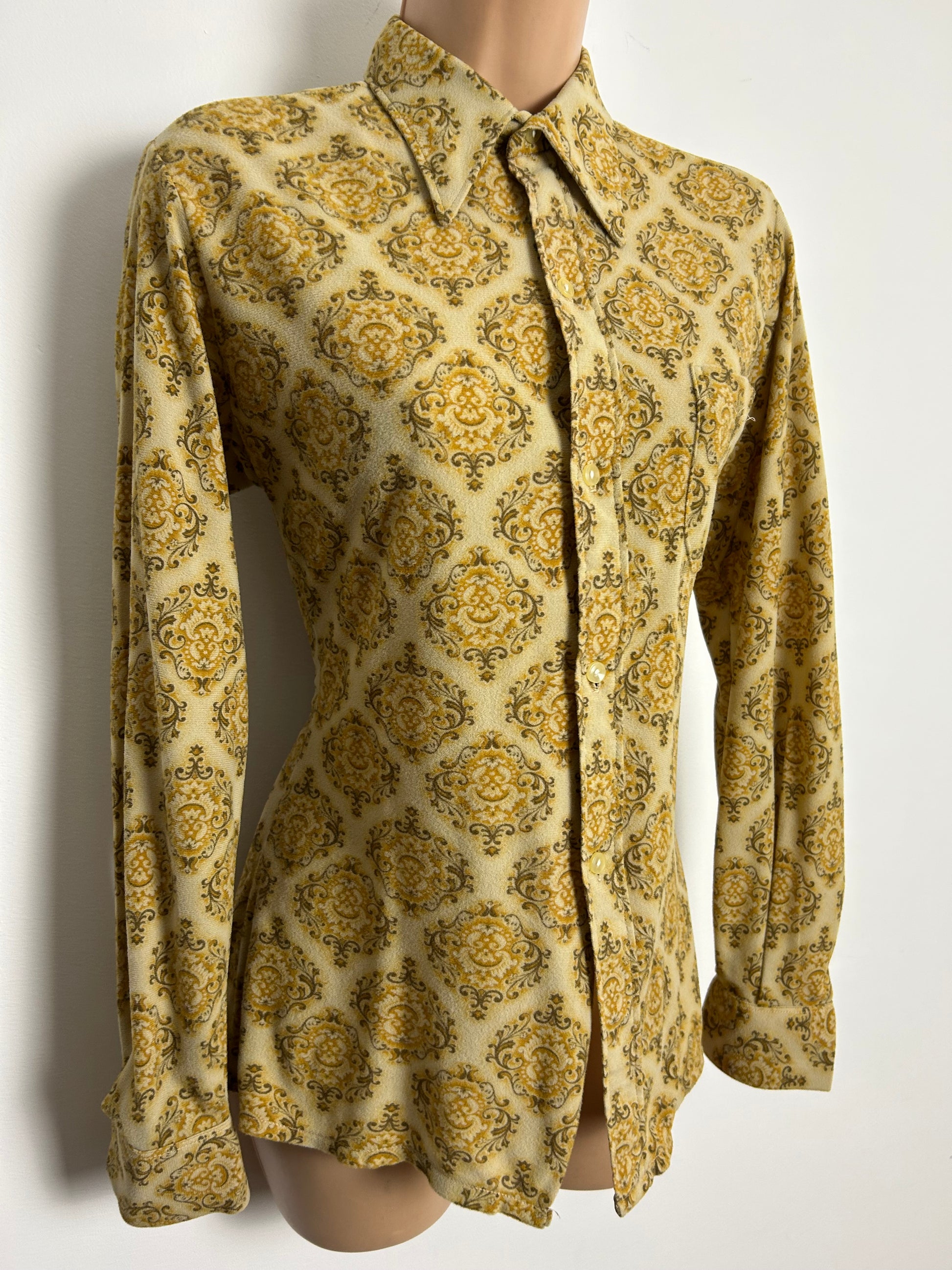 Vintage 1970s Size 12 Sandy Beige Tone Nouveau Scarf Print Long Sleeve Shirt