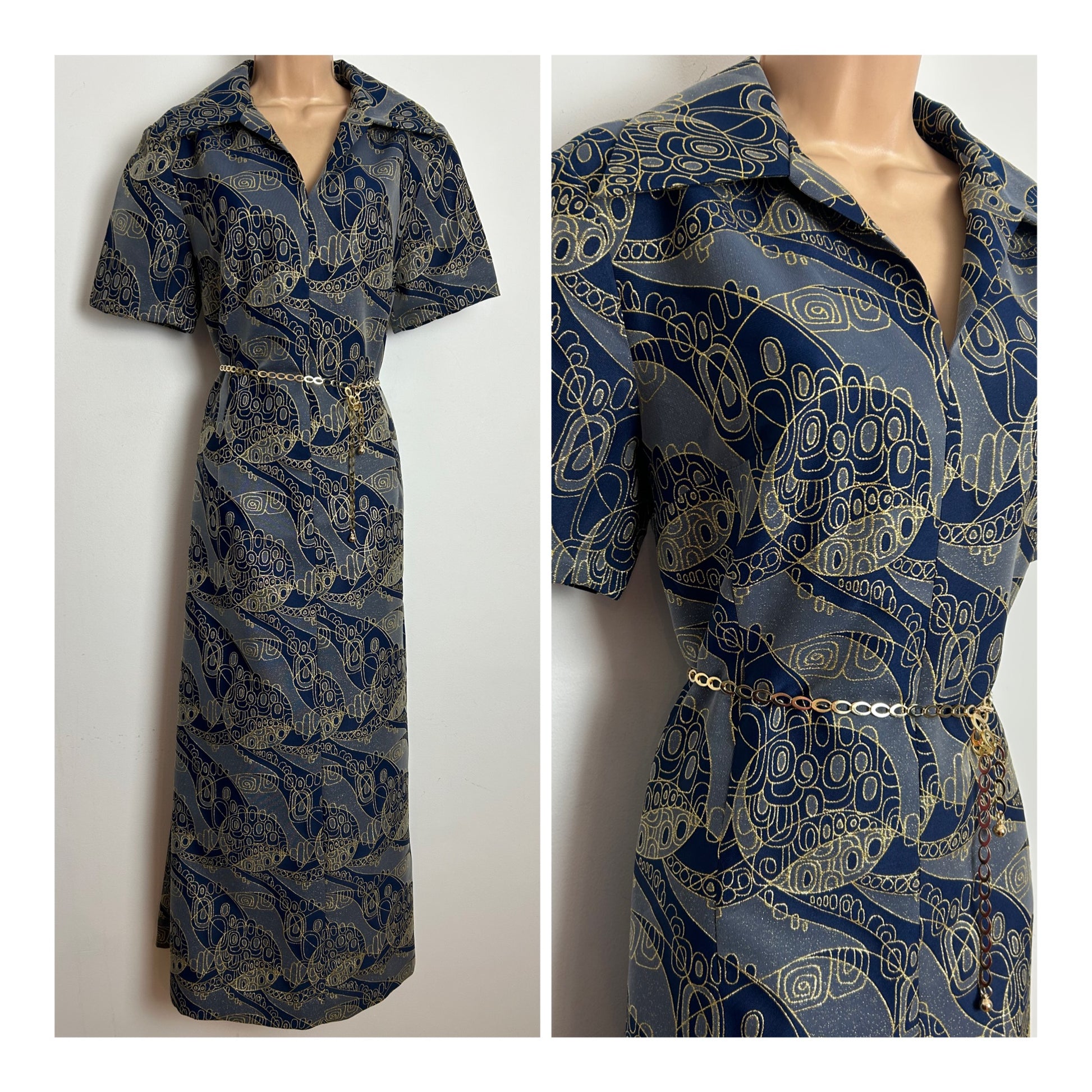 This lovely vintage maxi dress is made from a polyester fabric in blue tones with metallic gold abstract pattern.