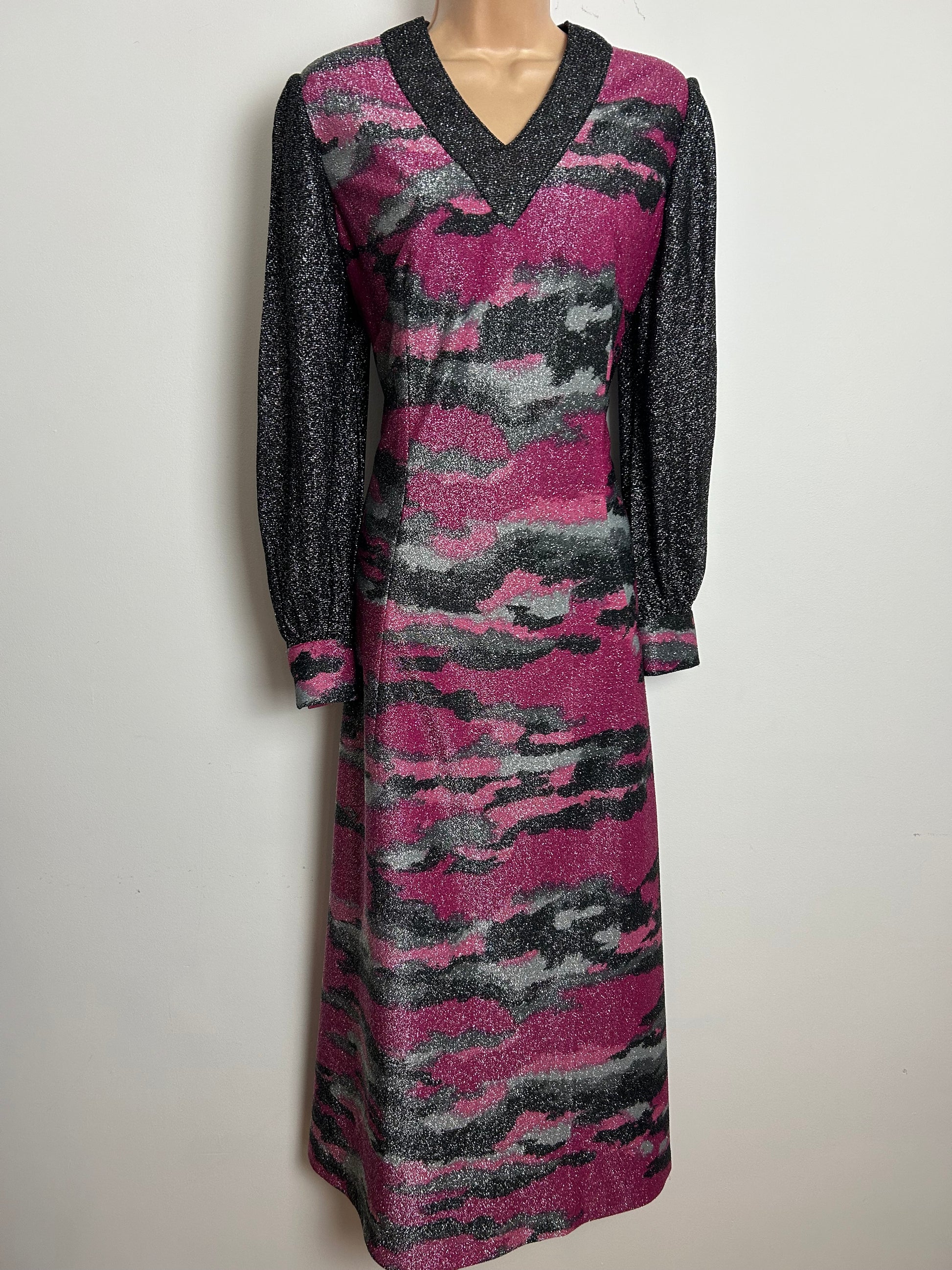 Vintage 1970s Size 14 Grey Silver & Pink Tones Abstract Print Lurex Long Sleeve Occasion Maxi Dress