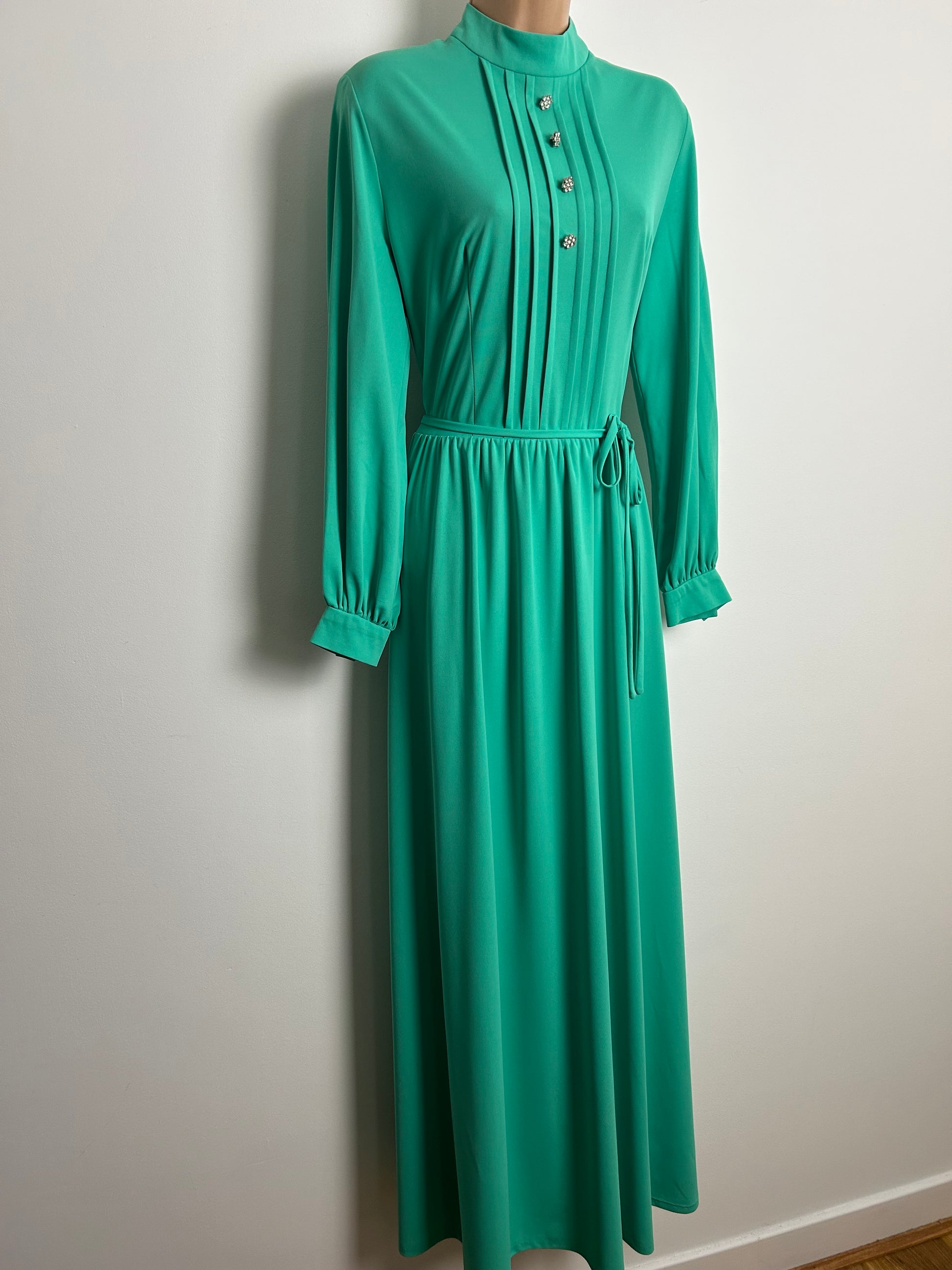 Vintage 1970s Size 14 Mint Green Diamante Buttons Long Sleeve Belted Occasion Maxi Dress