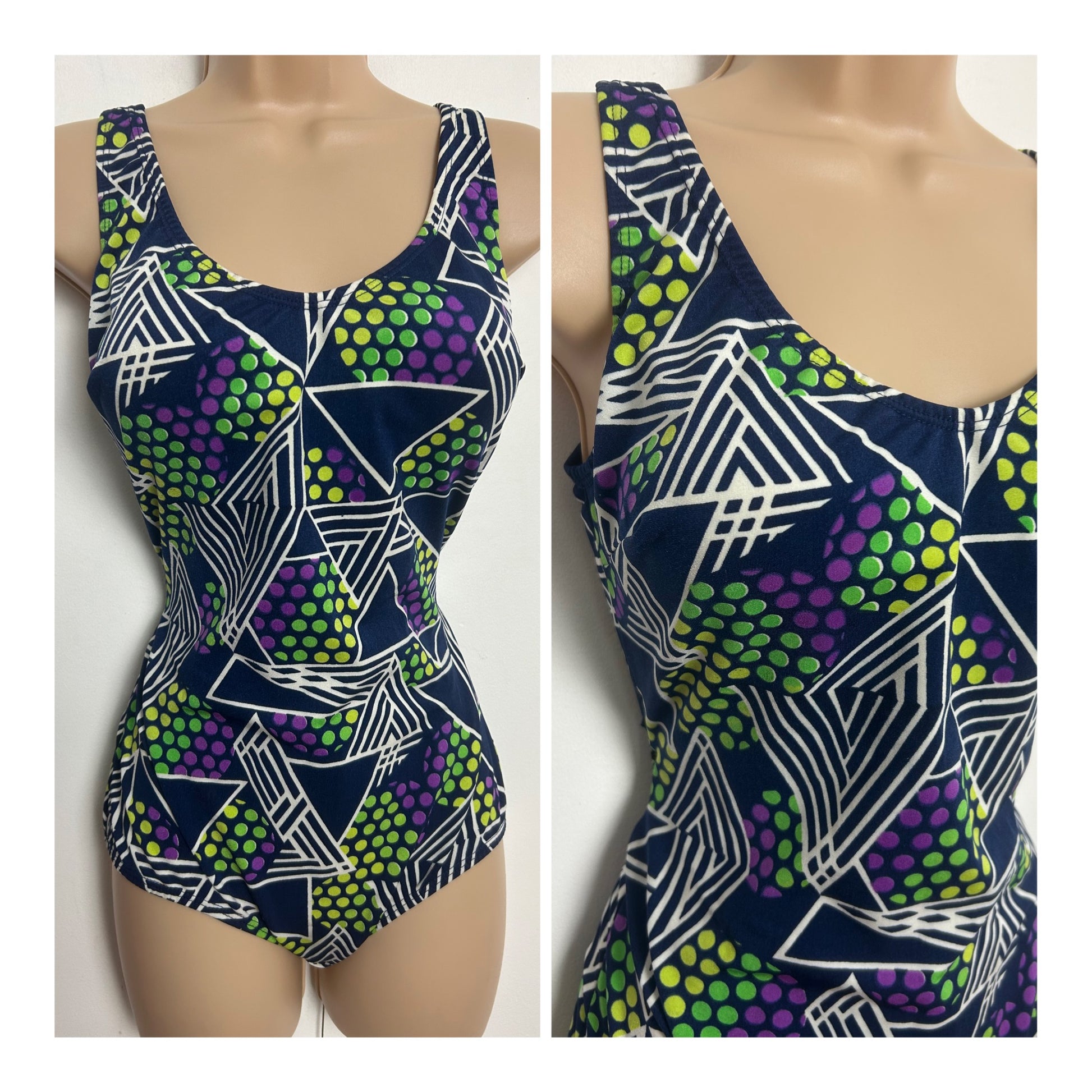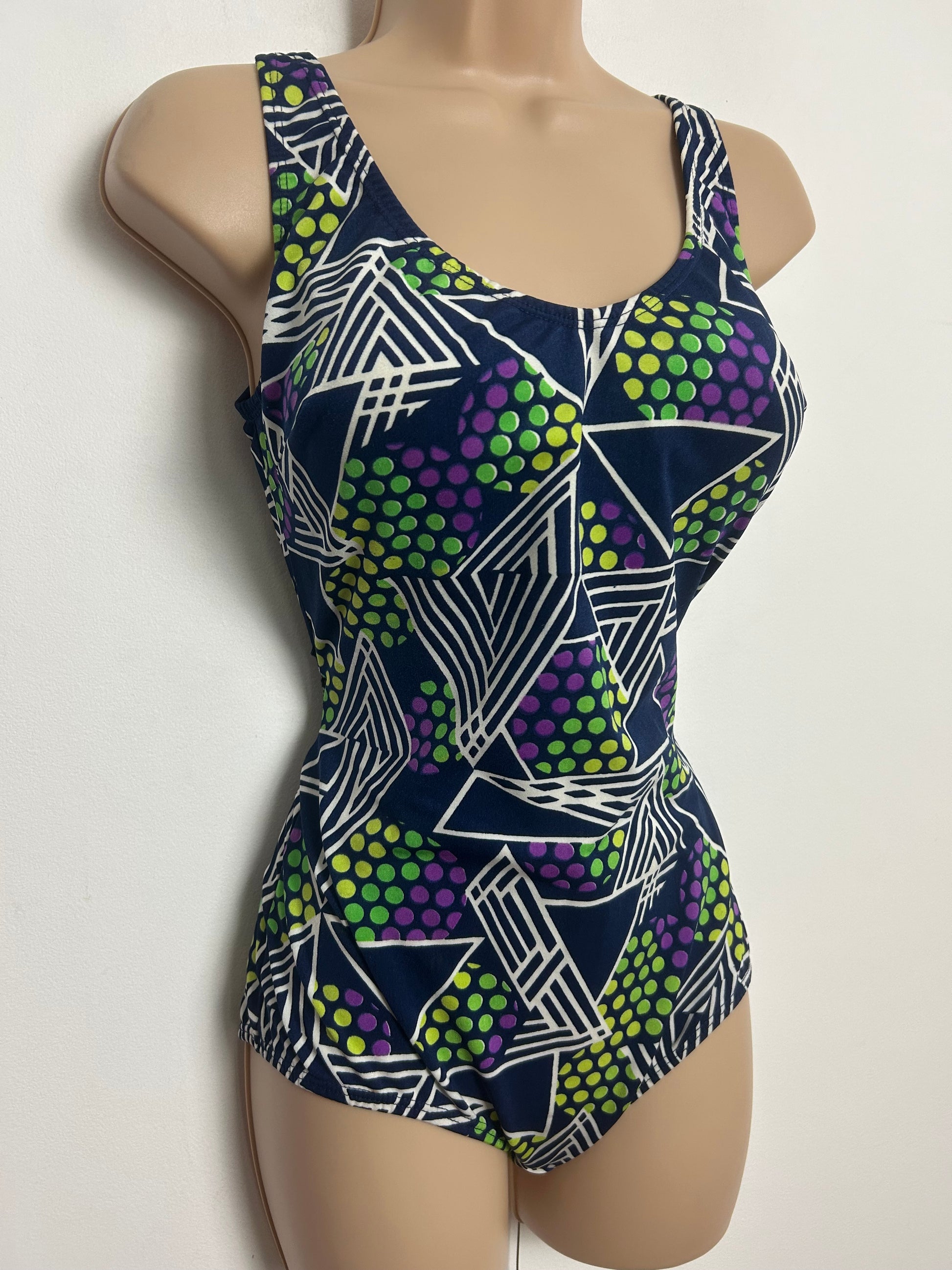 Vintage 1970s Size 14 Navy Blue White Green & Purple Stripe Geo & Spot Print Moulded Cups Swimsuit