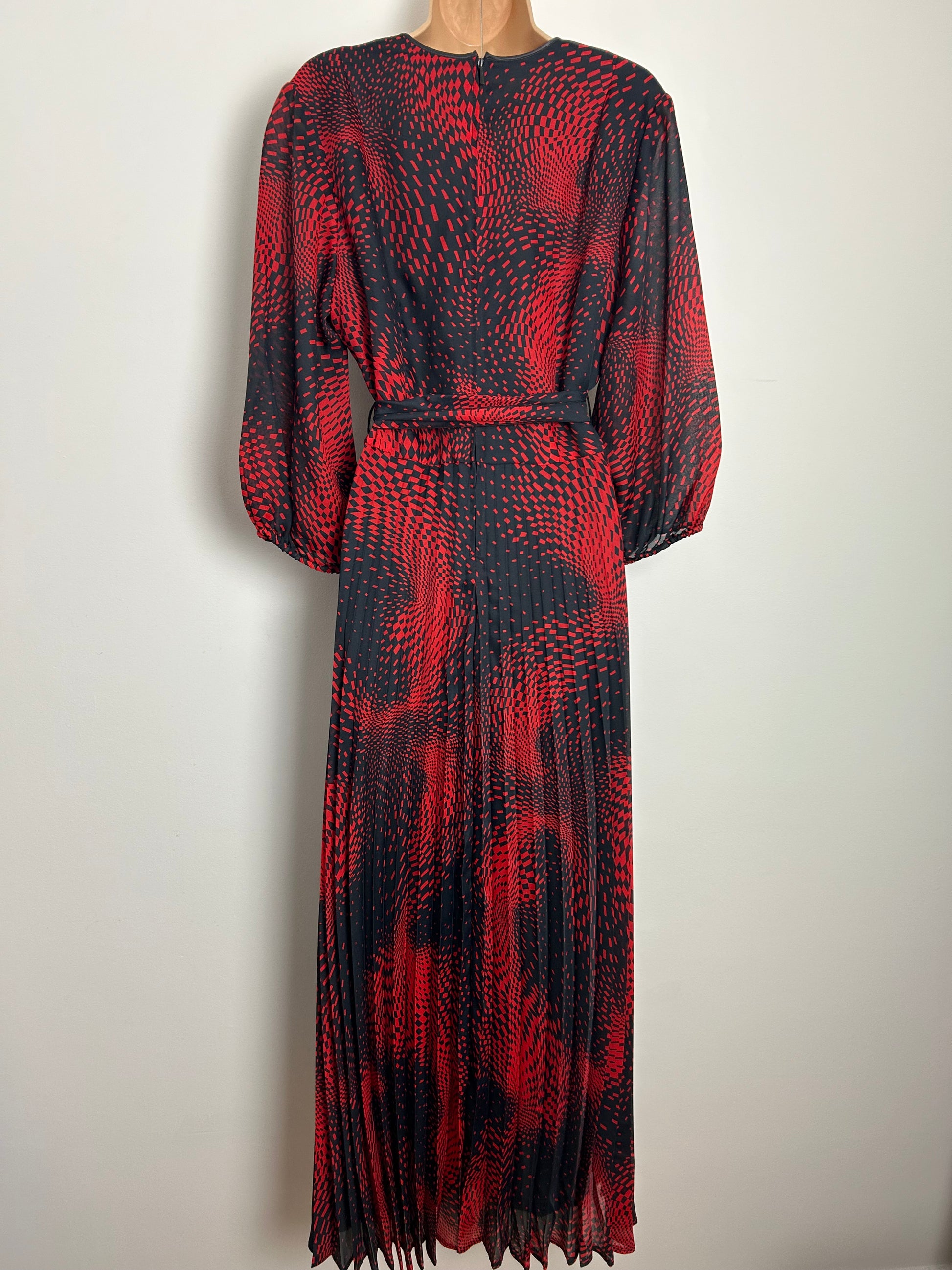 Vintage 1970s Size 16 Black & Red Op Art Print Belted Pleated Maxi Dress