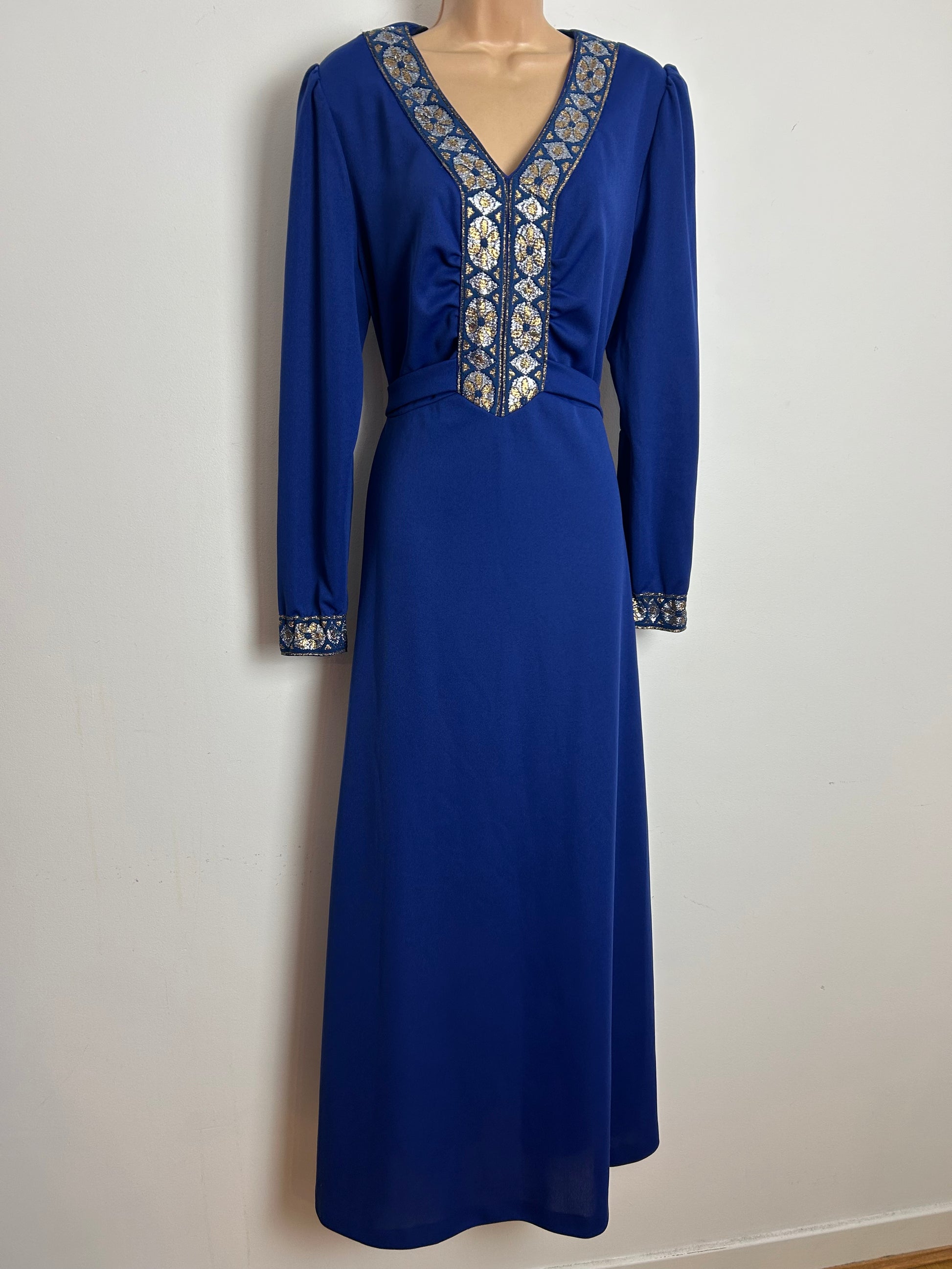 Vintage 1970s Size 16 Navy Blue Silver & Gold Braid Trim Long Sleeve Tie Back Evening Maxi Dress