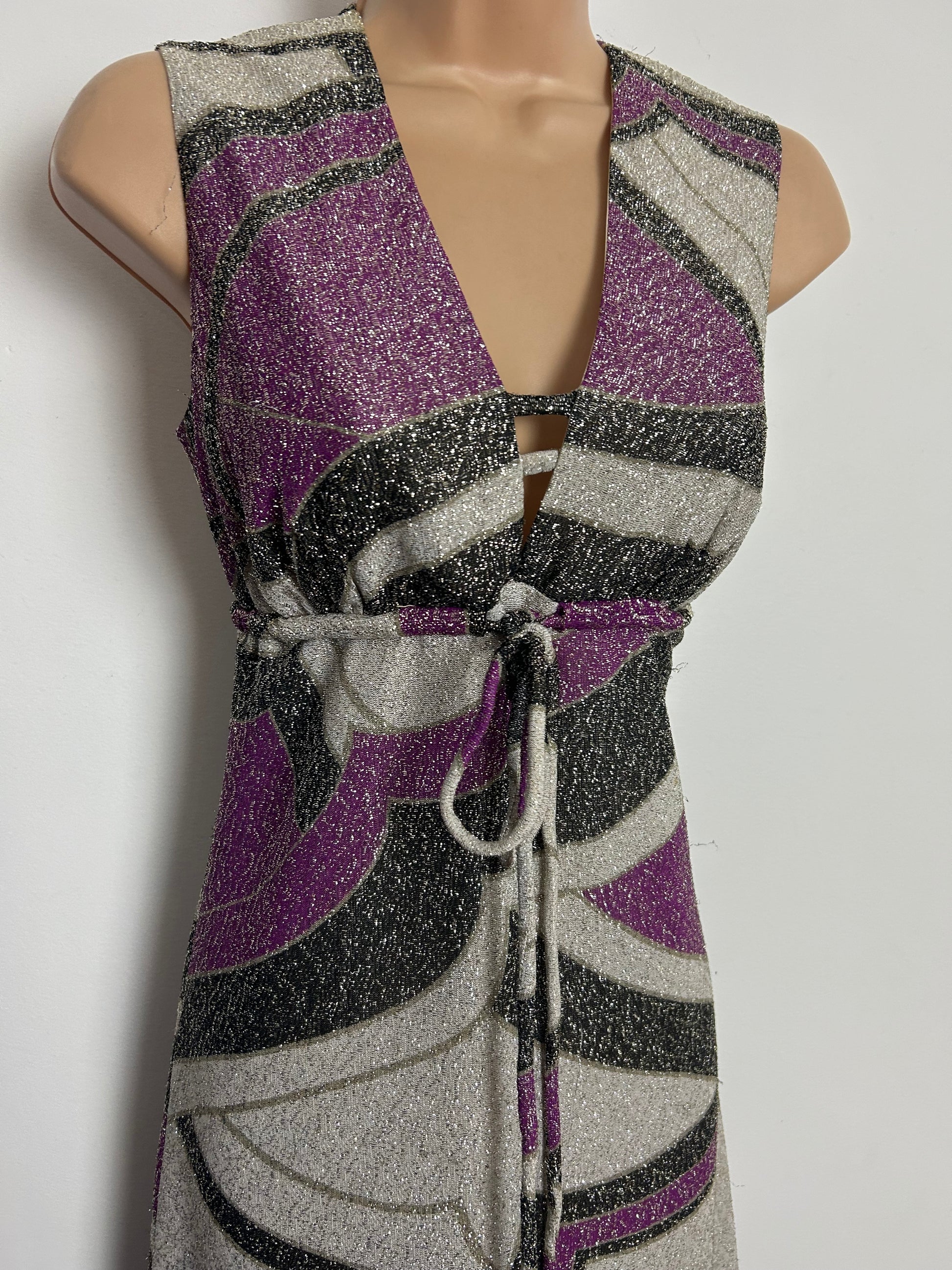Vintage 1970s Size 6-8 Grey Silver & Purple Tones Abstract Print Lurex Occasion Evening Maxi Dress