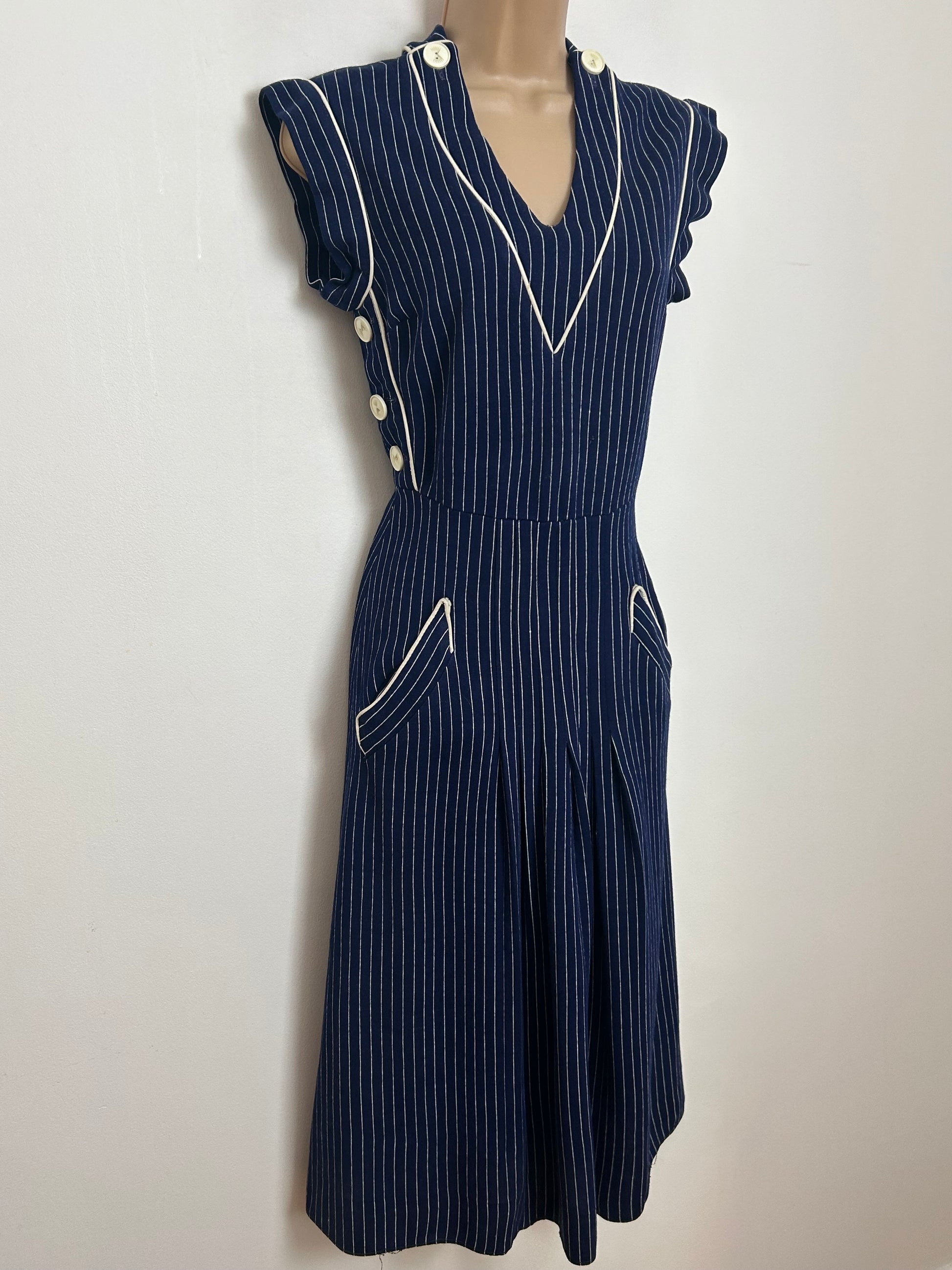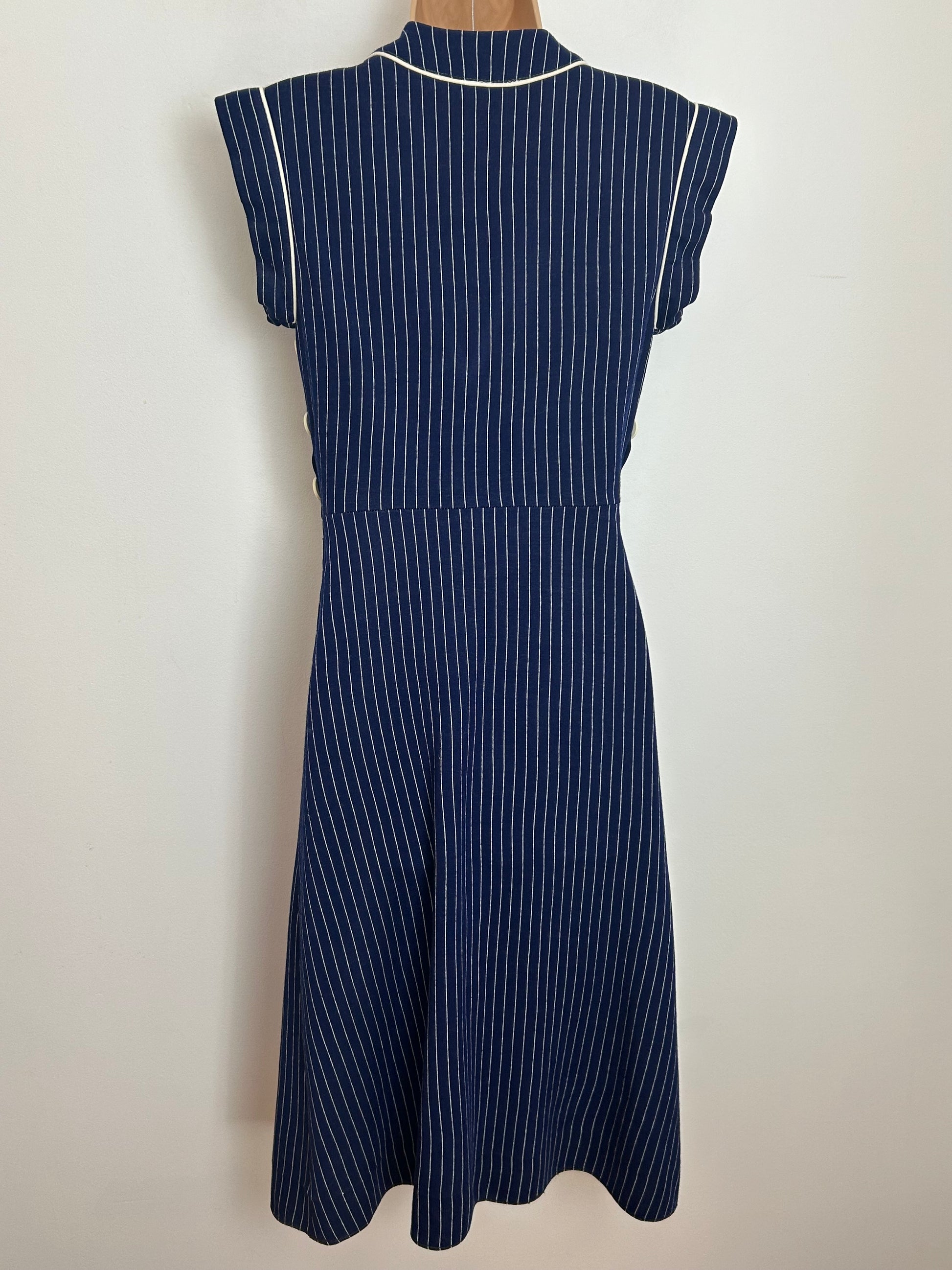 This fab little vintage day dress is made from a mid weight jersey feel wool mix fabric in navy blue & white stripe print.