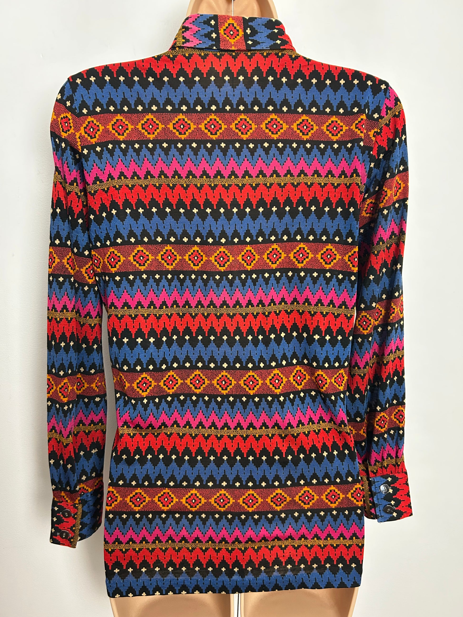 Vintage 1970s Size 8-10 Blue Red & Pink Abstract Print Long Sleeve Shirt