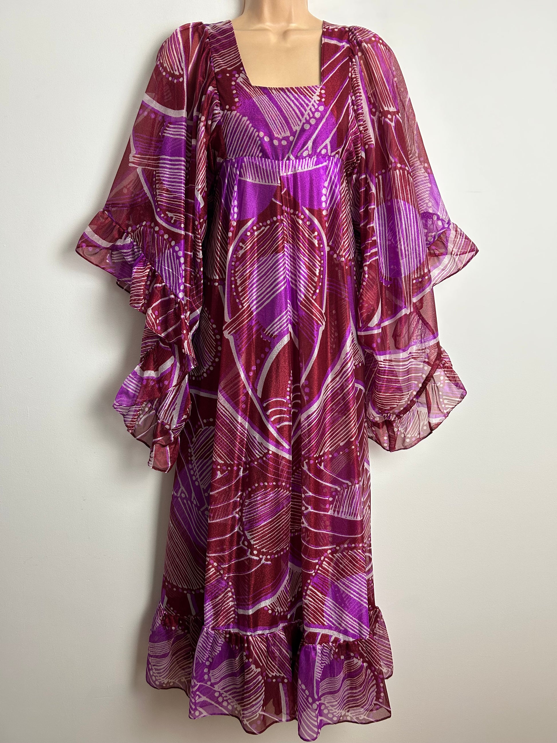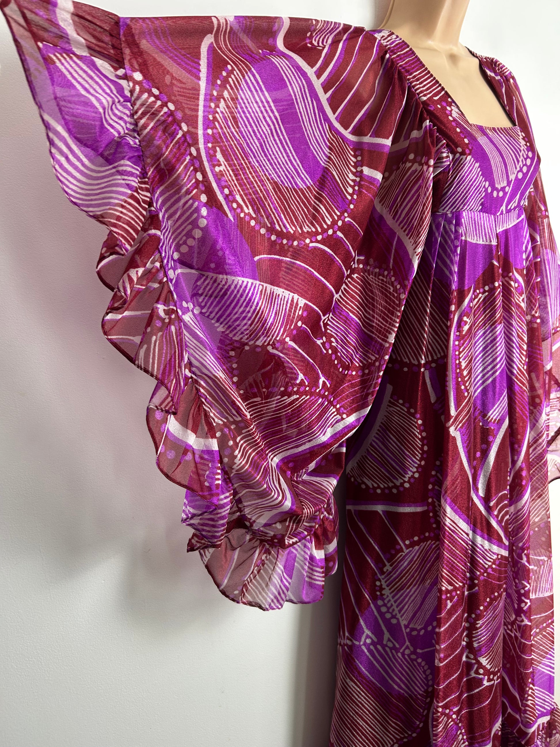 Vintage 1970s Size 10 Plum & Purple Abstract Pattern Nylon Very Wide Angel Sleeve Maxi Dress