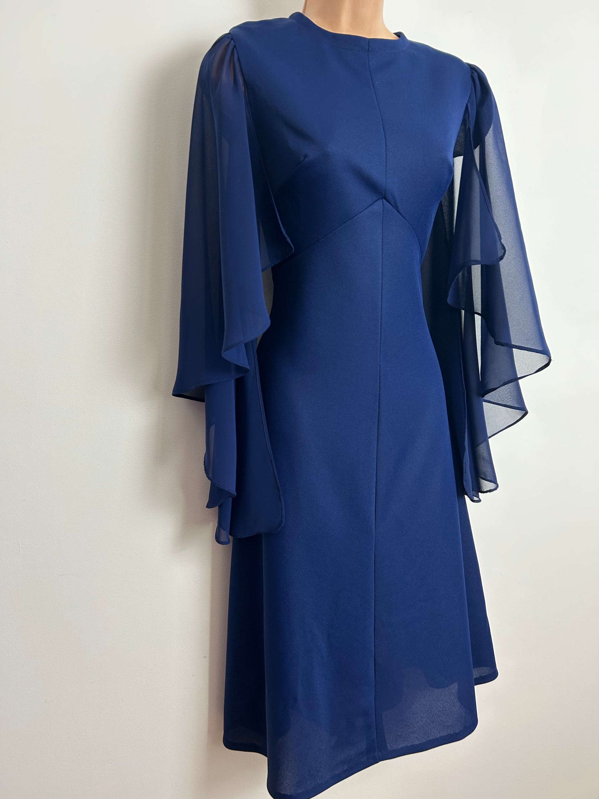Vintage 1970s Size 8-10 Navy Blue Floaty Chiffon Cape Sleeve Occasion Midi Dress