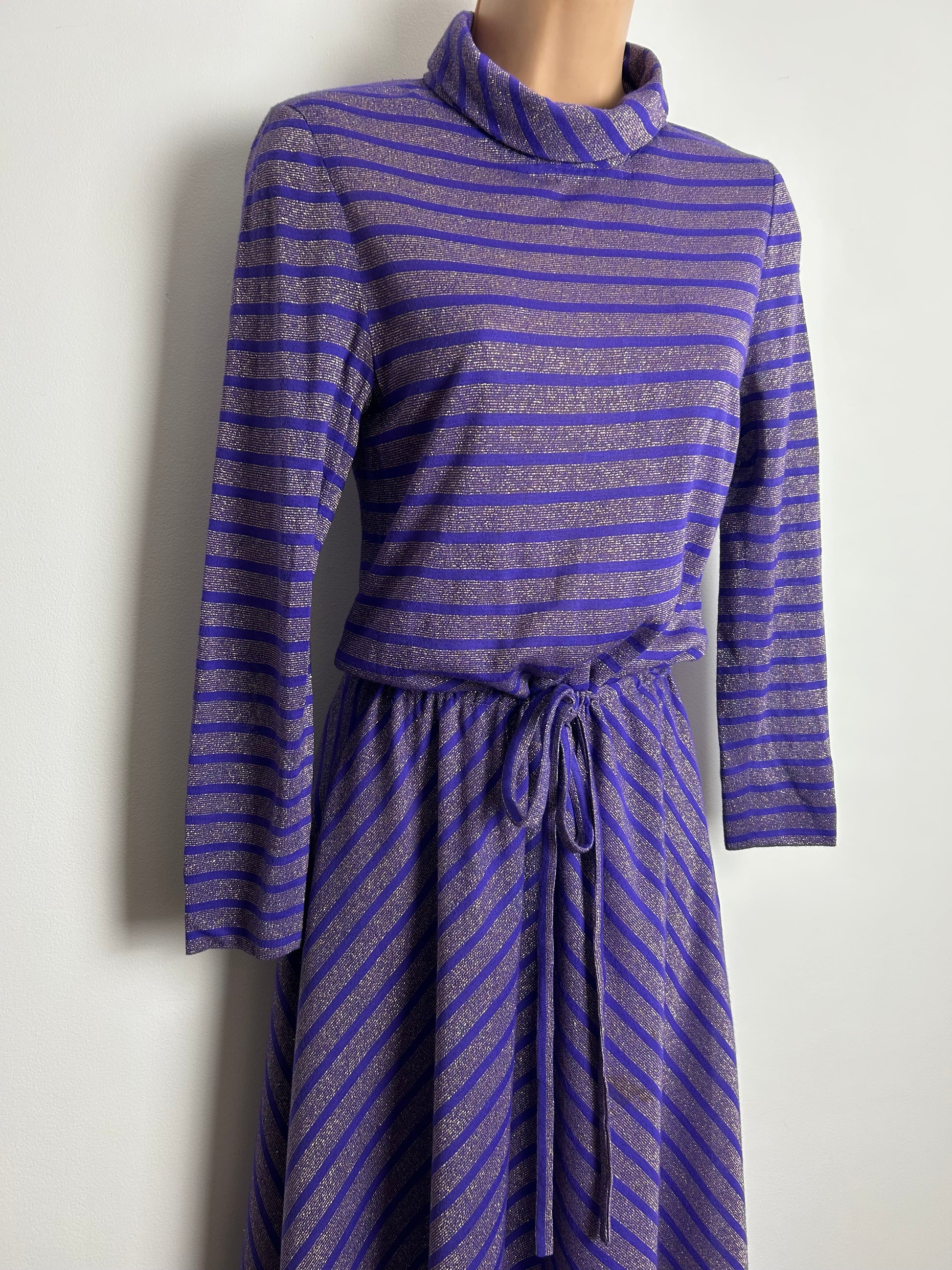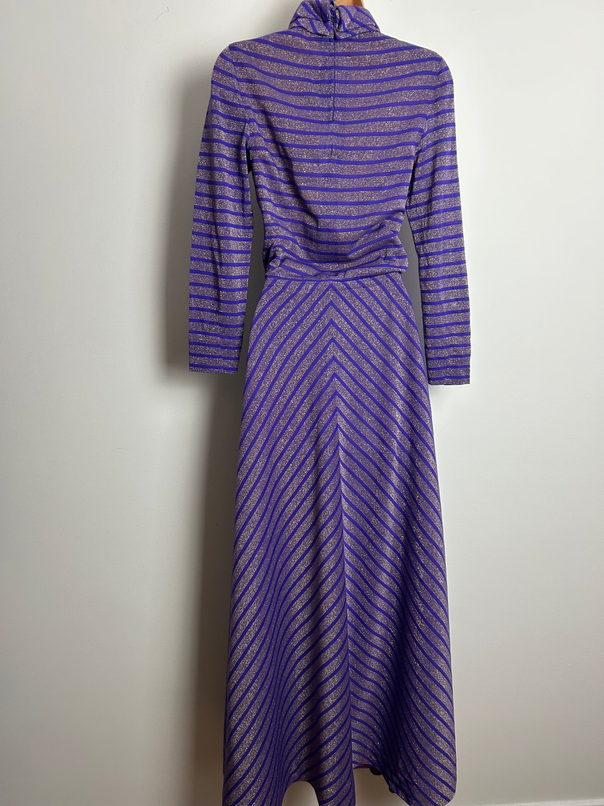 This lovely vintage maxi dress is made from a polyester lurex fabric in purple & metallic gold stripe pattern.