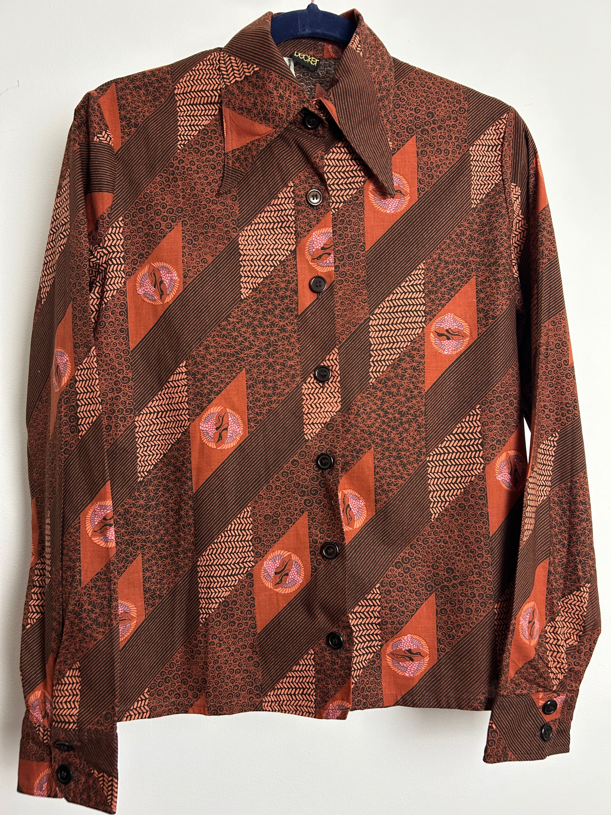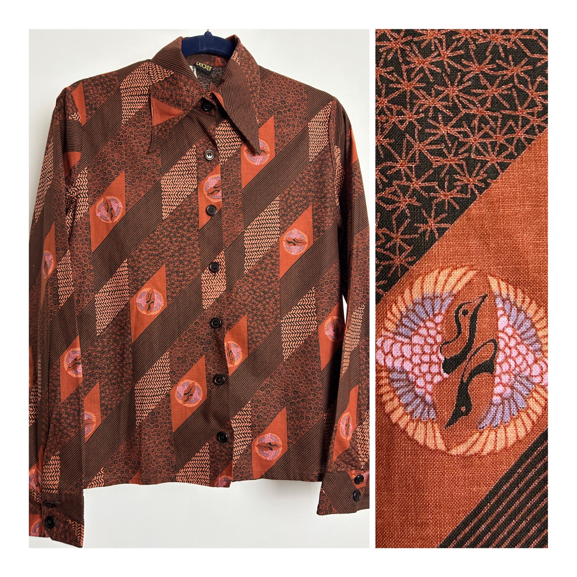 Vintage 1970s STUDIO BECKER Size 8-10 Brown Tones Abstract & Bird Print Cotton Shirt