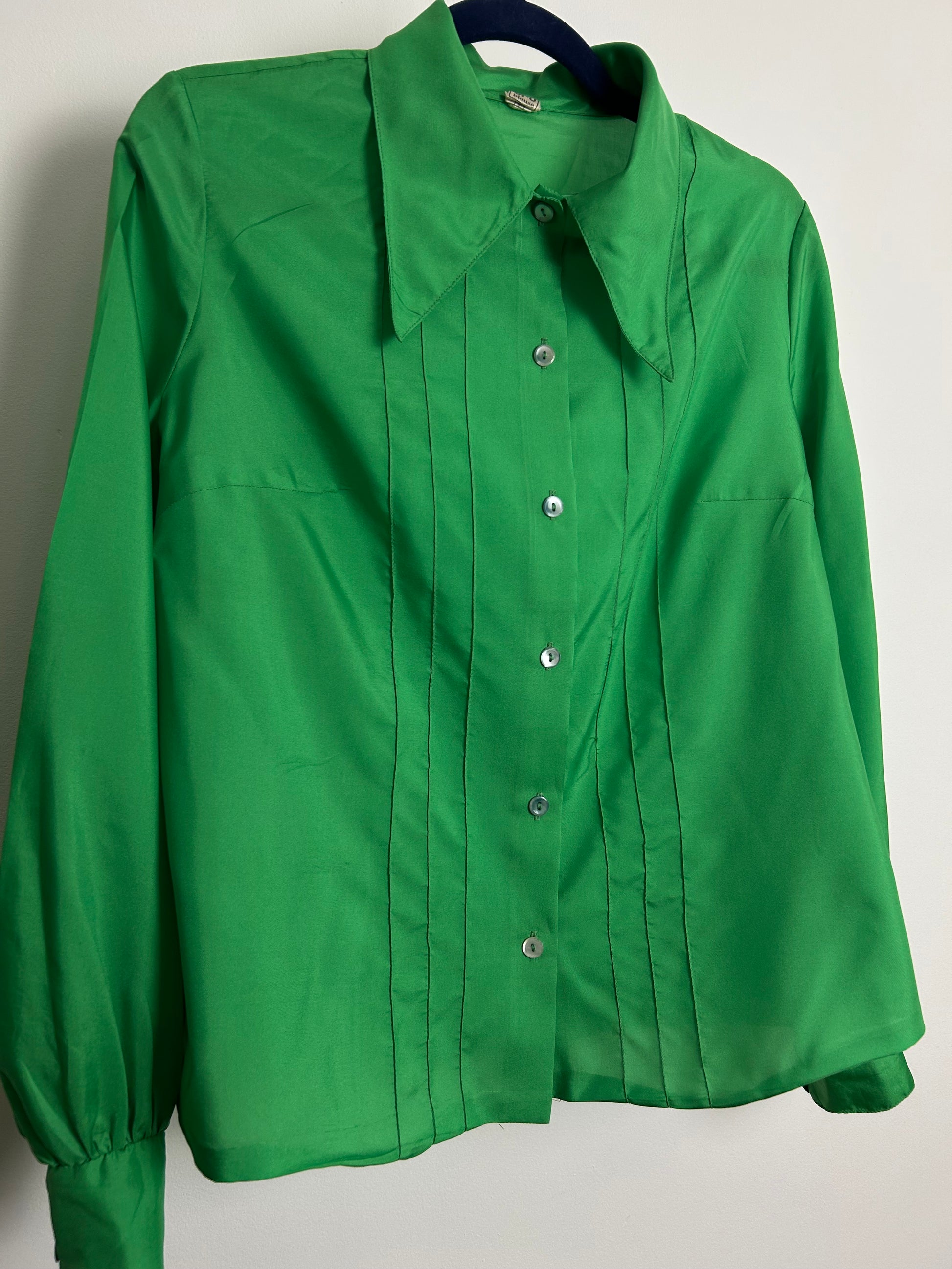 This lovely vintage shirt is made from a silky green 100% polyester in green.