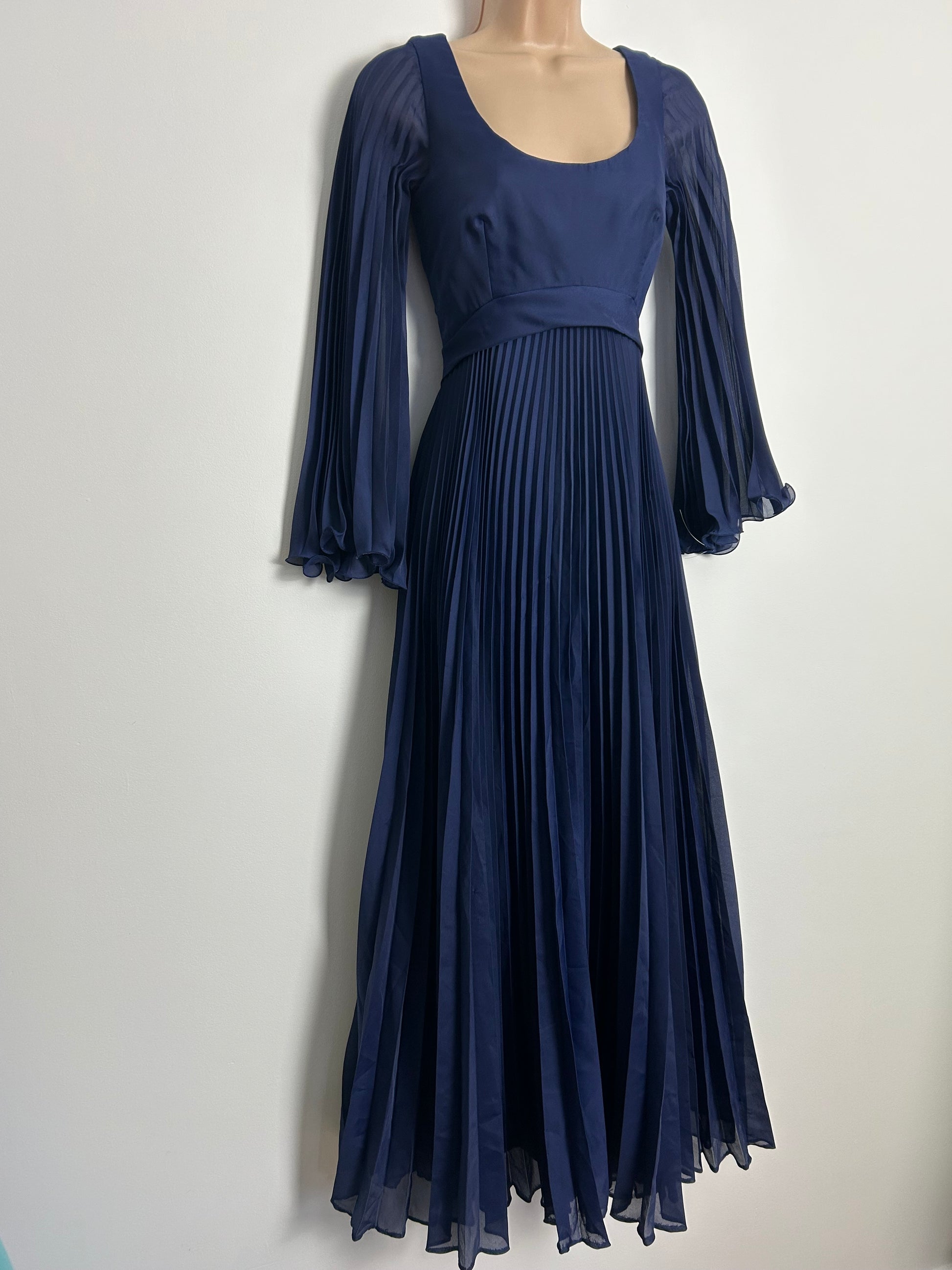 Vintage 1970s UK Size 6 Navy Blue Pleated Long Sleeve Empire Line Occasion Maxi Dress