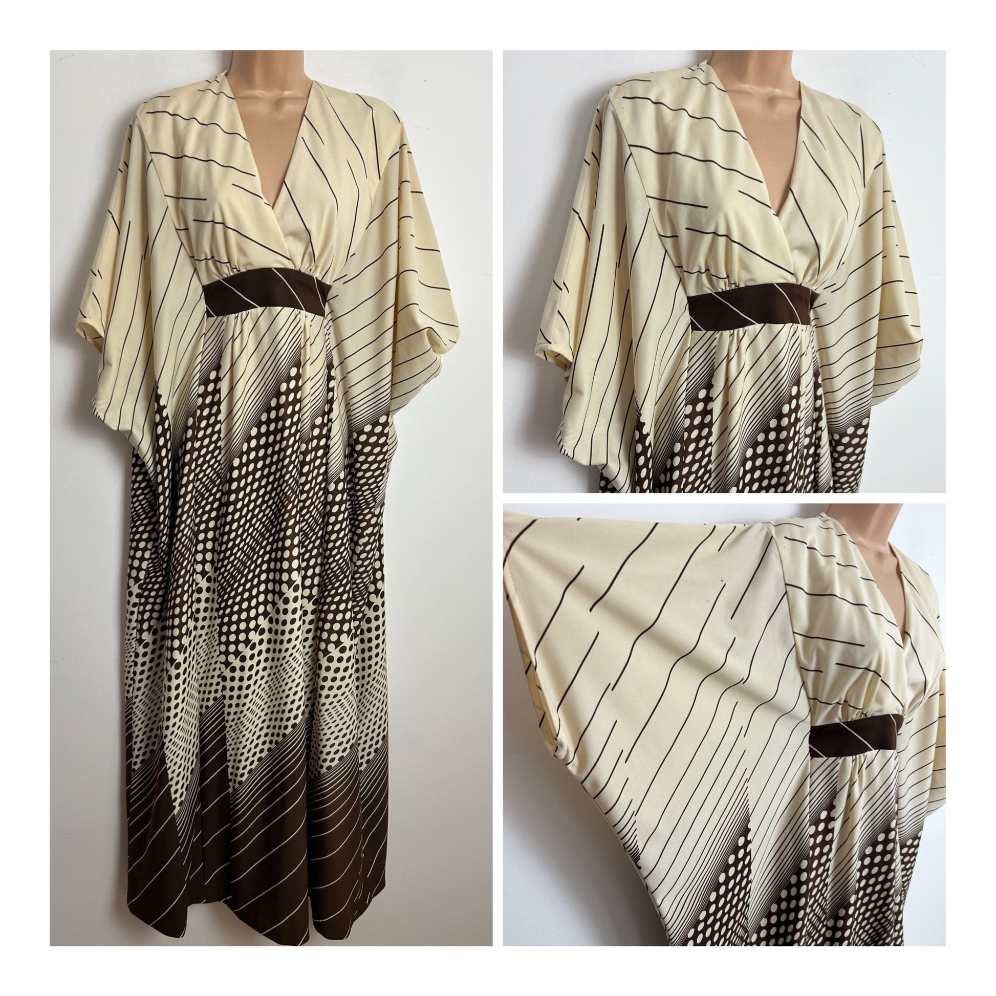 Vintage 1970s Up To Size 18/20 Cream & Brown Stripe & Polka Dot Print Wide Sleeve Kaftan Maxi Dress