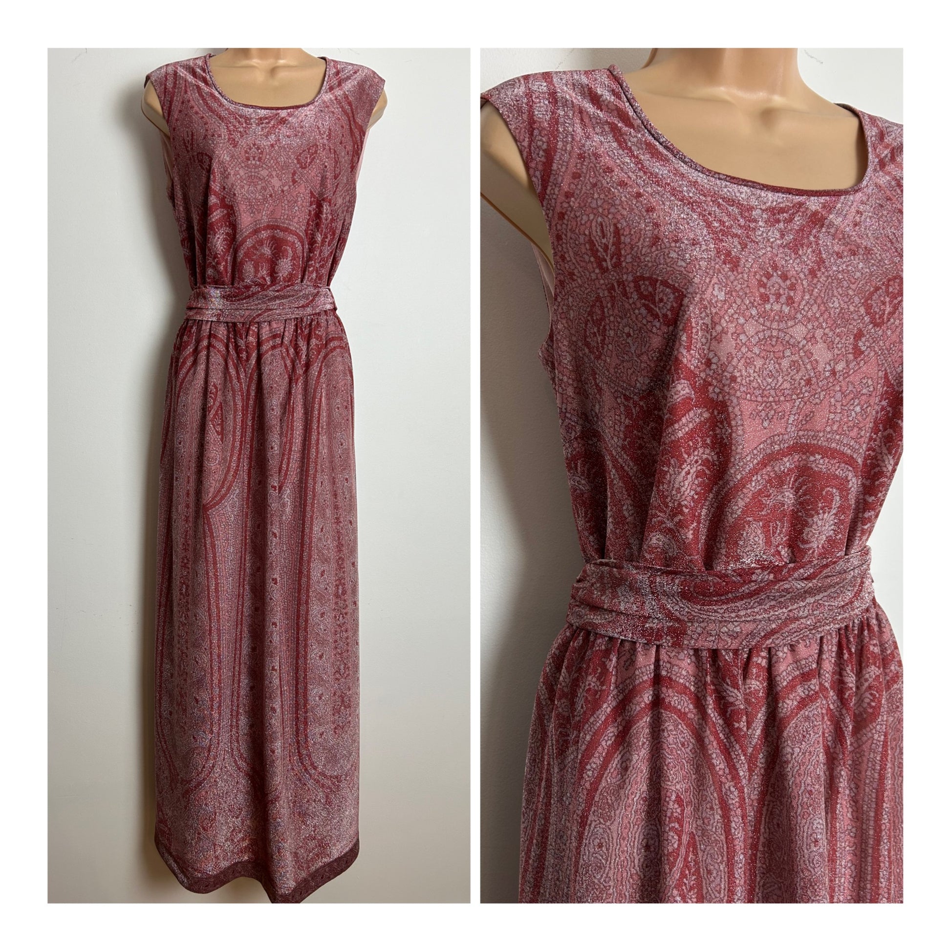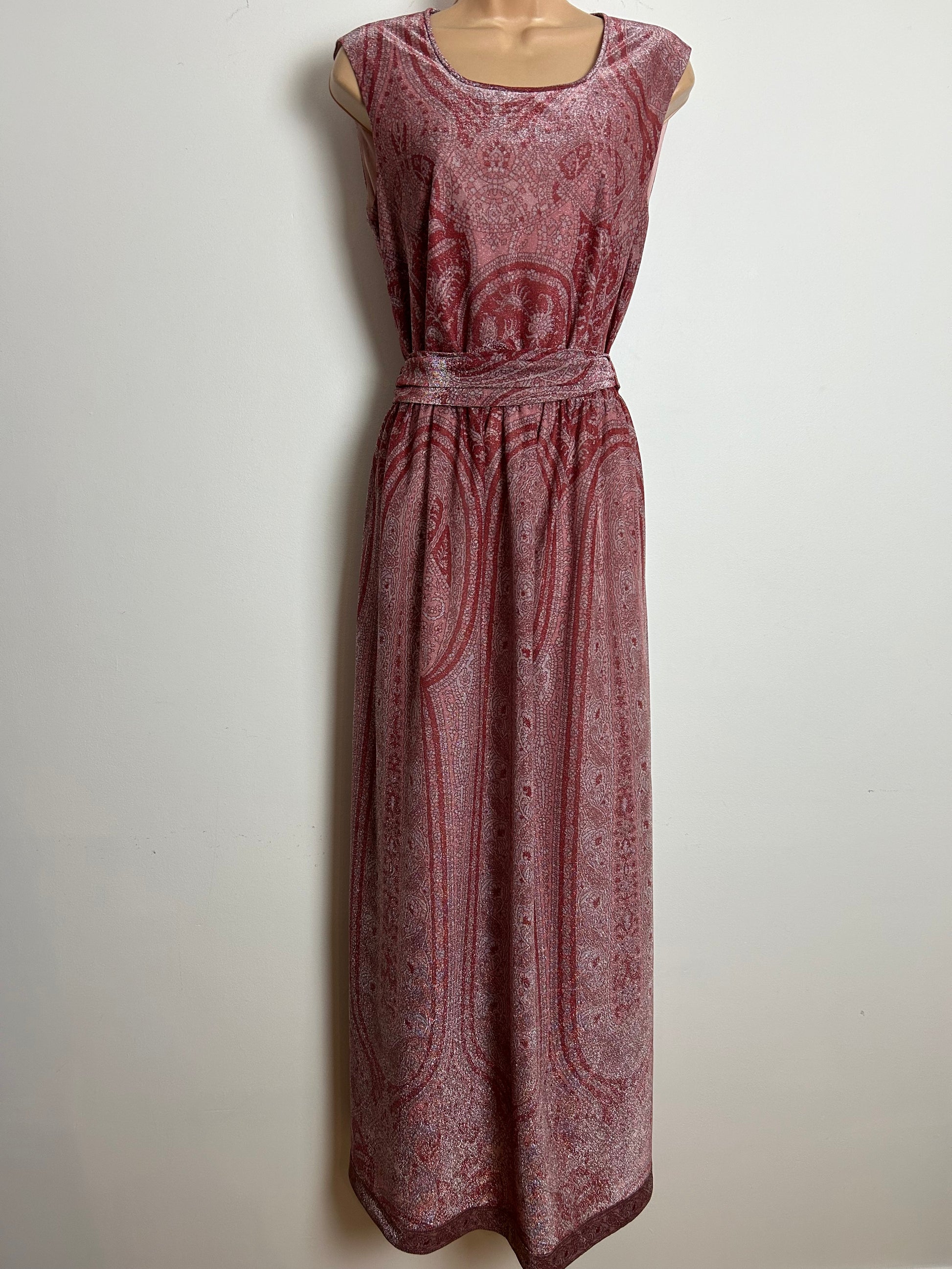 Vintage 1970s VERENA Size 10-12 Beautiful Dark Pink Tones Lurex Belted Evening Maxi Dress