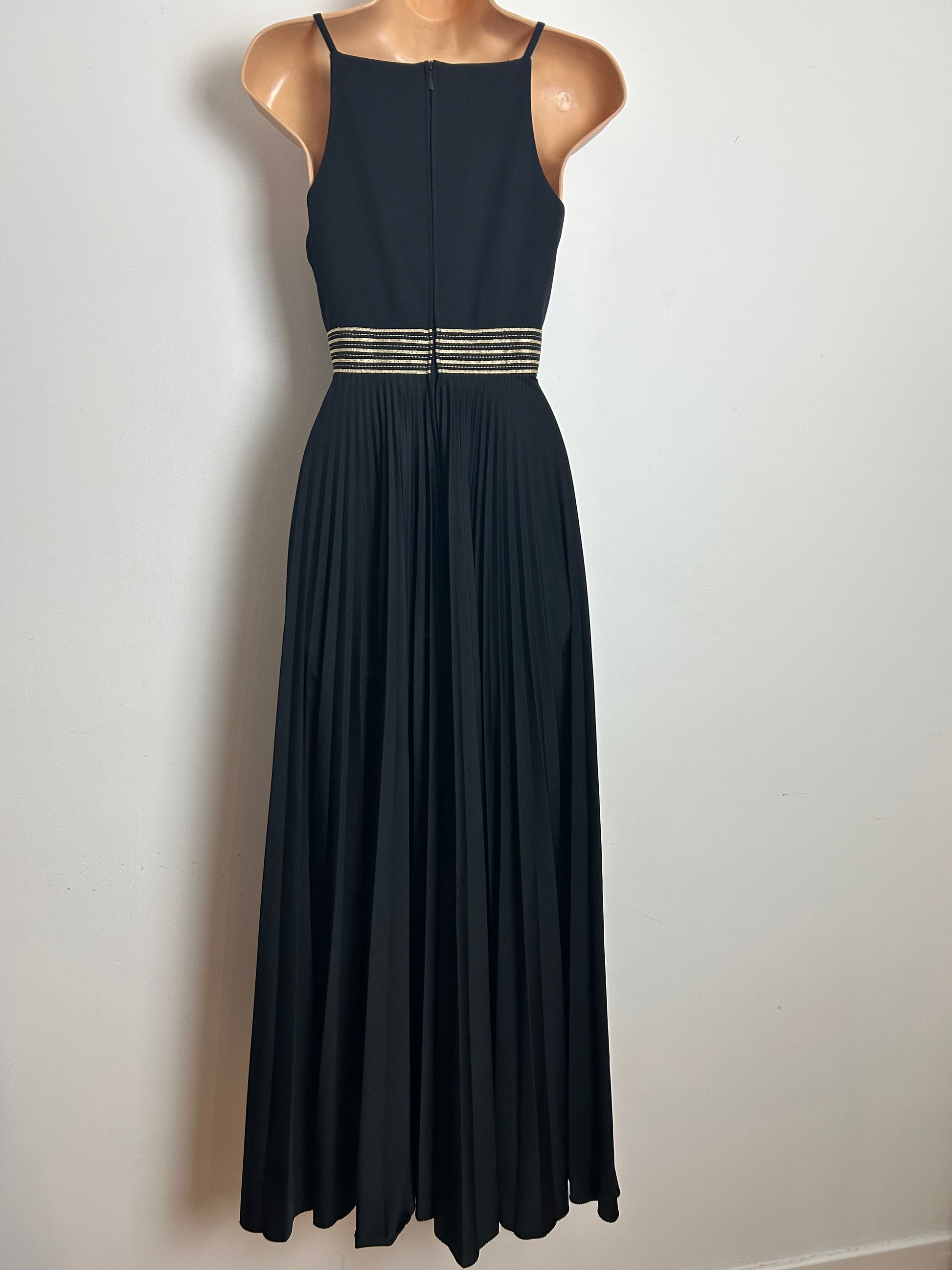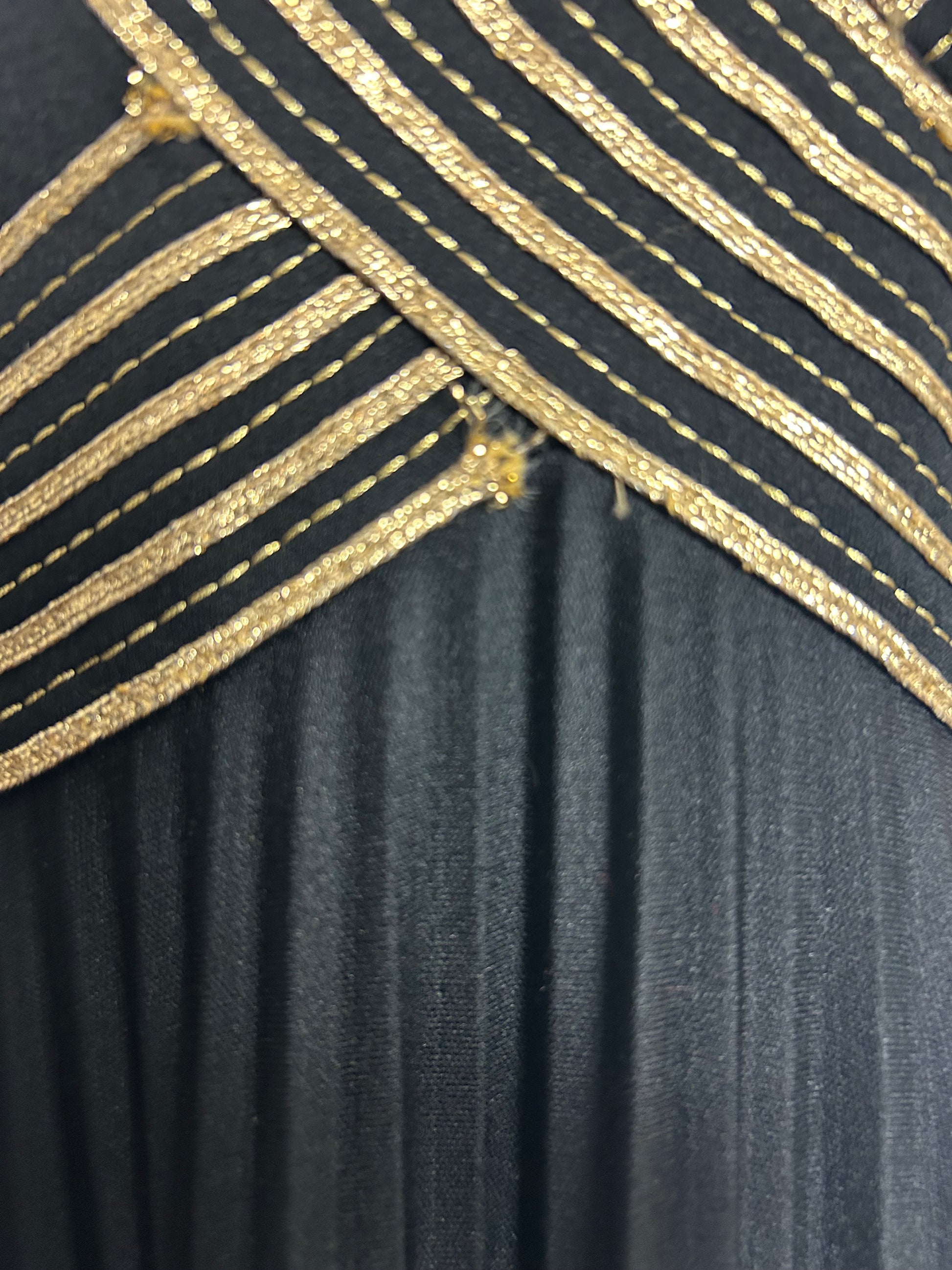 Vintage 1970s YVETTE Size 6-8 Black & Gold Braid Trim Pleated Empire Line Evening Maxi Dress