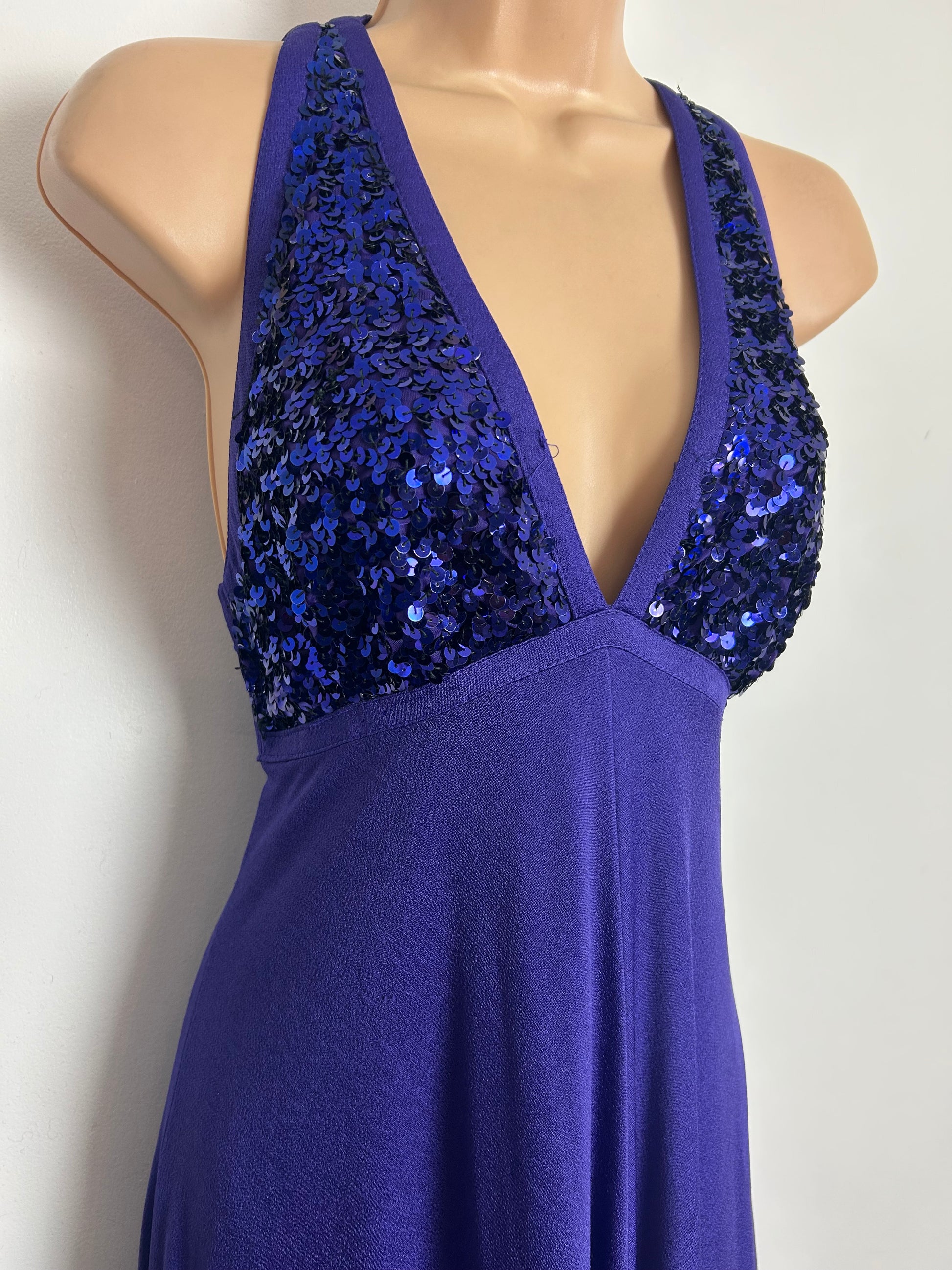 Vintage 1970s YVETTE Size 8 Purple Sequin Bodice Plunge Neck Evening Party Maxi Dress