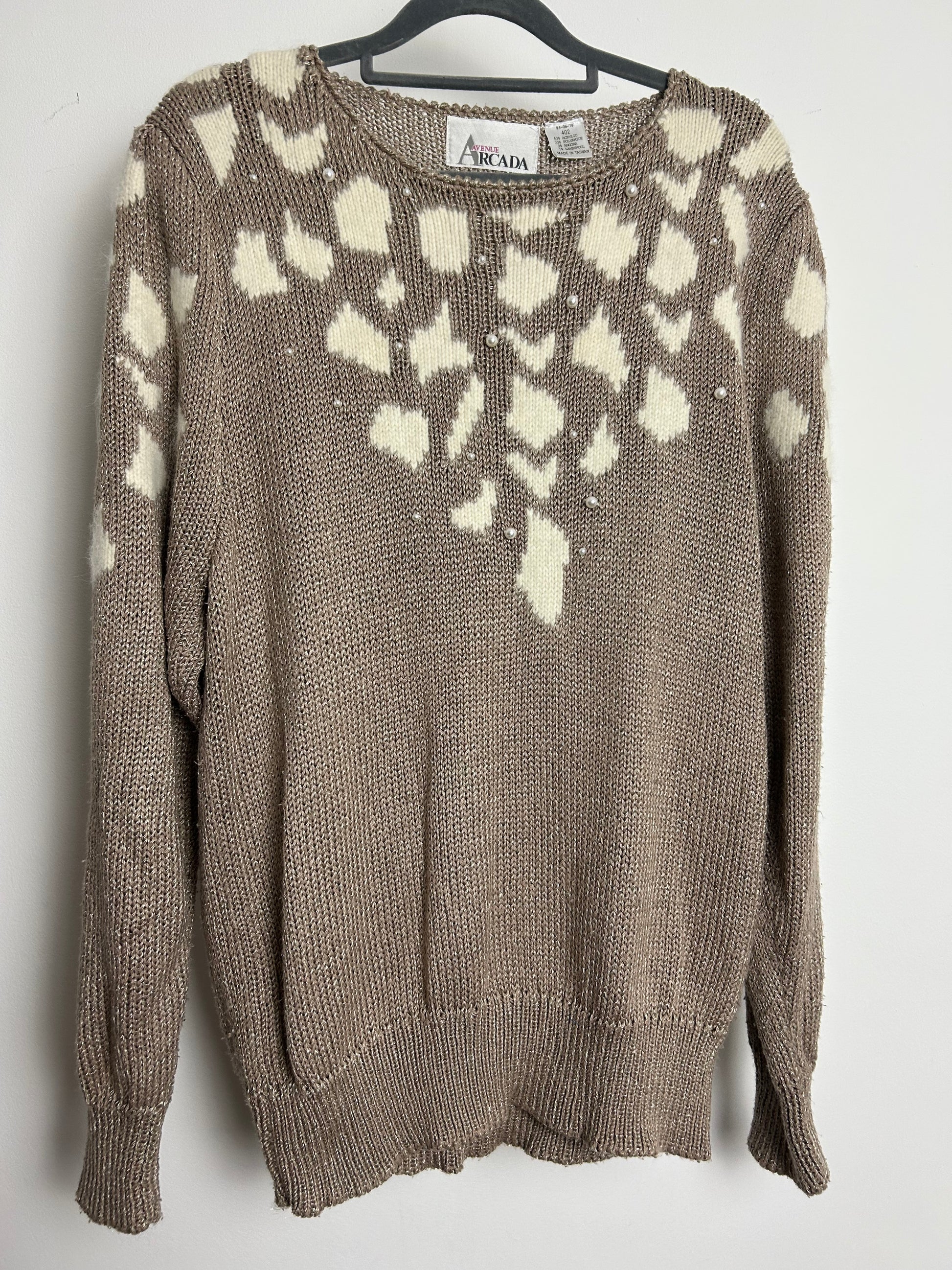 Vintage 1980s ARCADIA AVENUE Up To Size 14/16 Light Brown & Cream Animal Print Bead Detail Jumper
