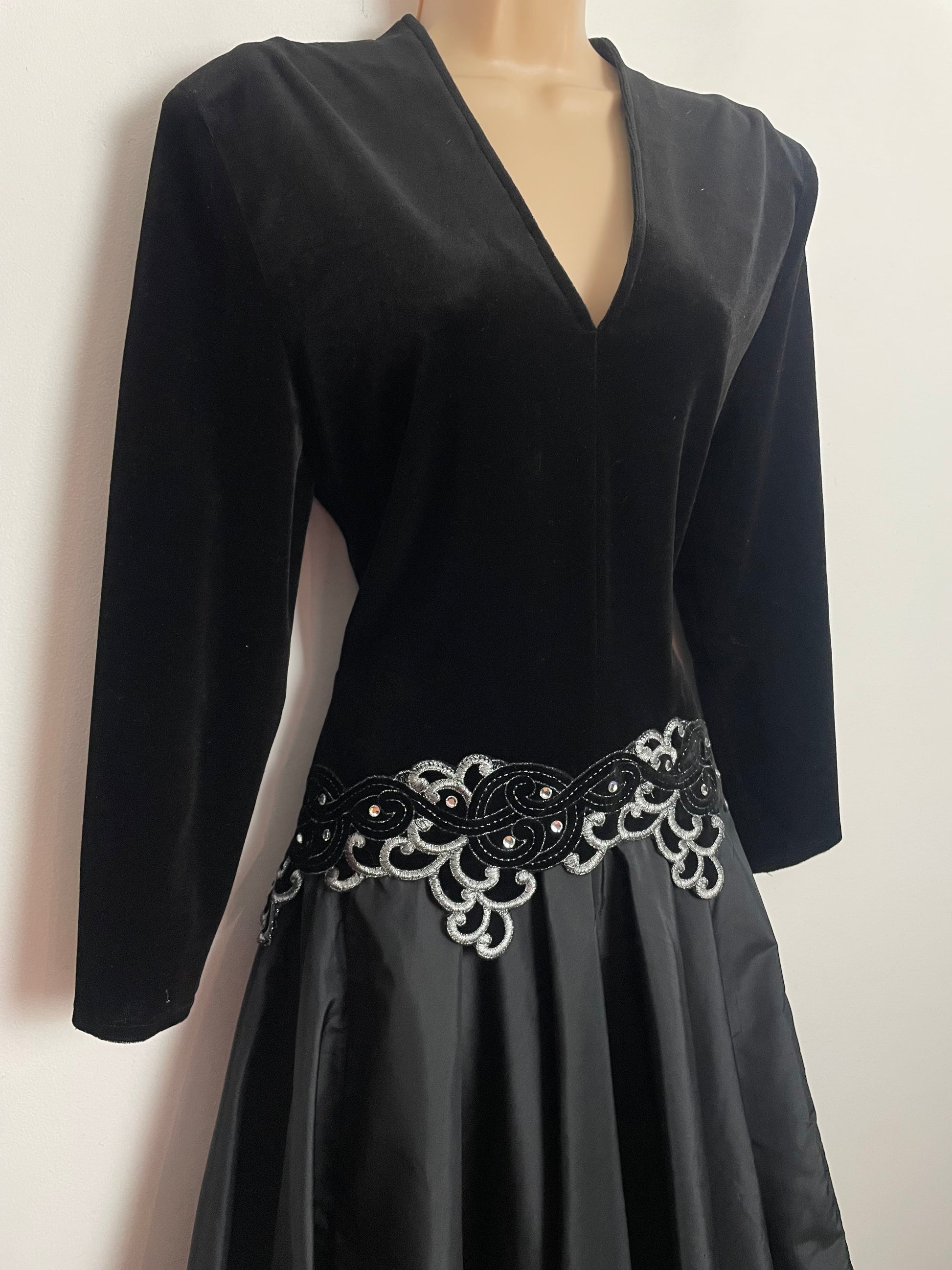 Vintage 1980s BERNSHAW UK Size 12 Black Velvet & Sateen Silver Thread & Diamante Detail Evening Party Occasion Dress