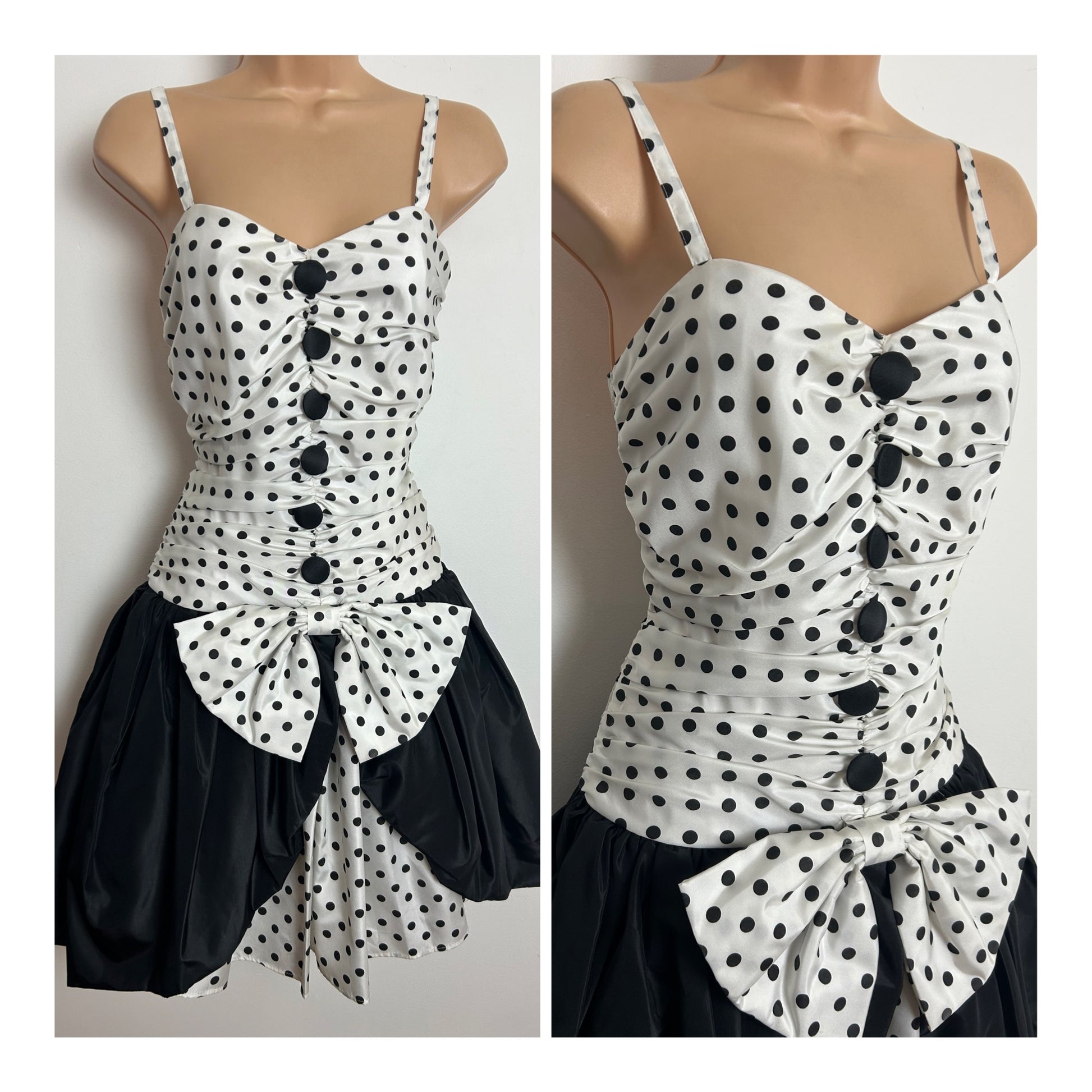 Vintage 1980s CREATION CHOU CHOU Size 10 White & Black Polka Dot Print Party Prom Dress