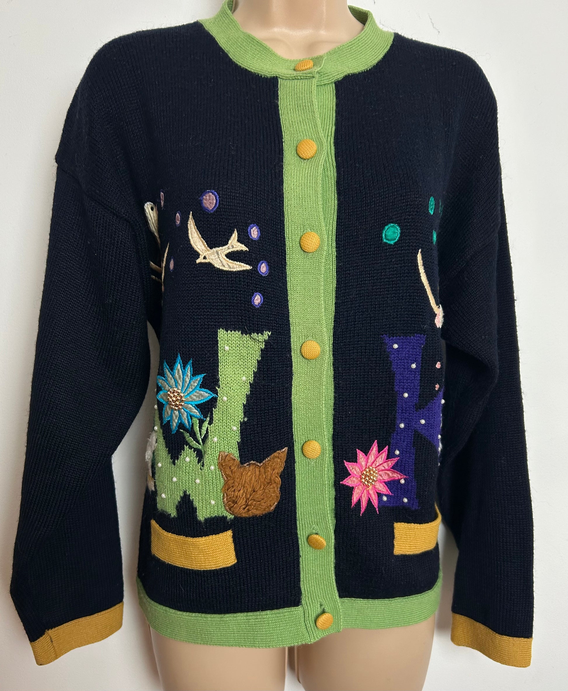 Vintage 1980s DECADE SIGNE KIABI Size 12/14 Black & Green Polar Bear Bird & Flowers Applique Detail Wool Cardigan