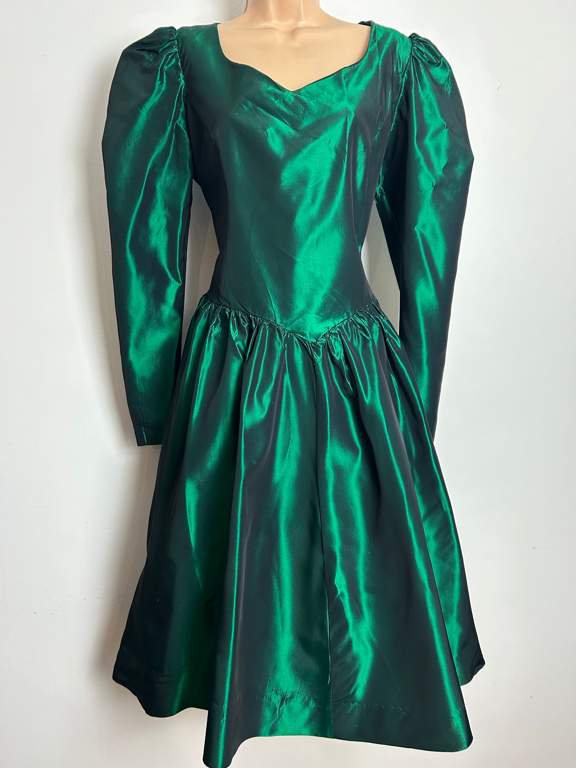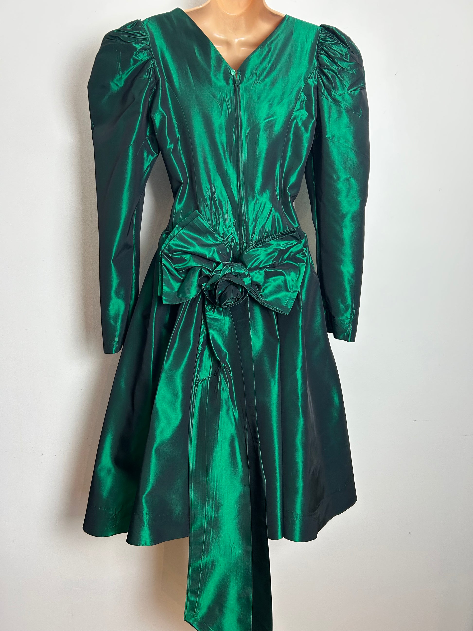 Vintage 1980s GLENDA WHITE Size 12-14 Bottle Green Taffeta Long Sleeve Bow Back Xmas Party Dress