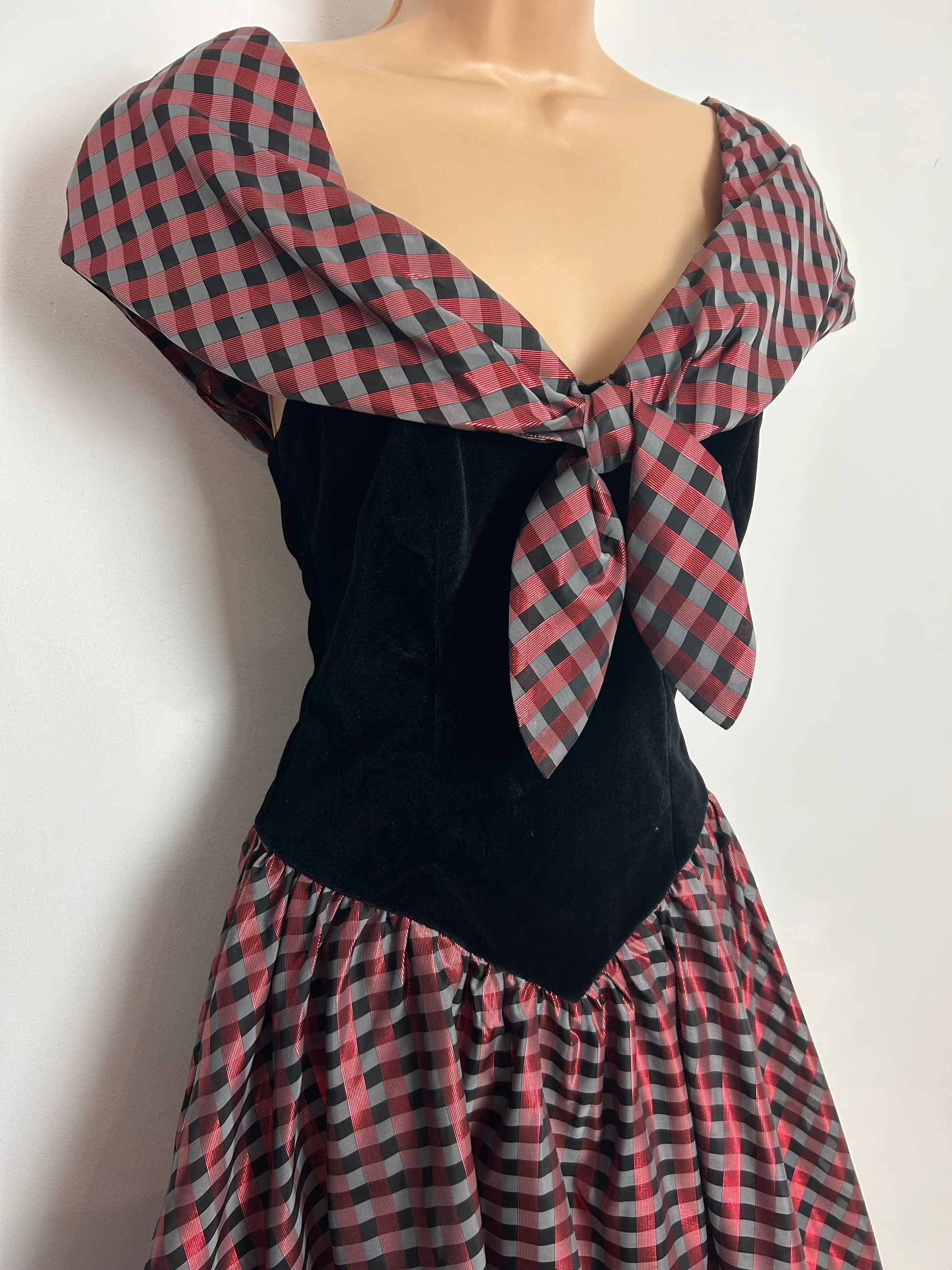 Vintage 1980s JAHN & PILL Size 8 Black Red & Grey Tartan Check Velvet & Taffeta Xmas Party Prom Dress