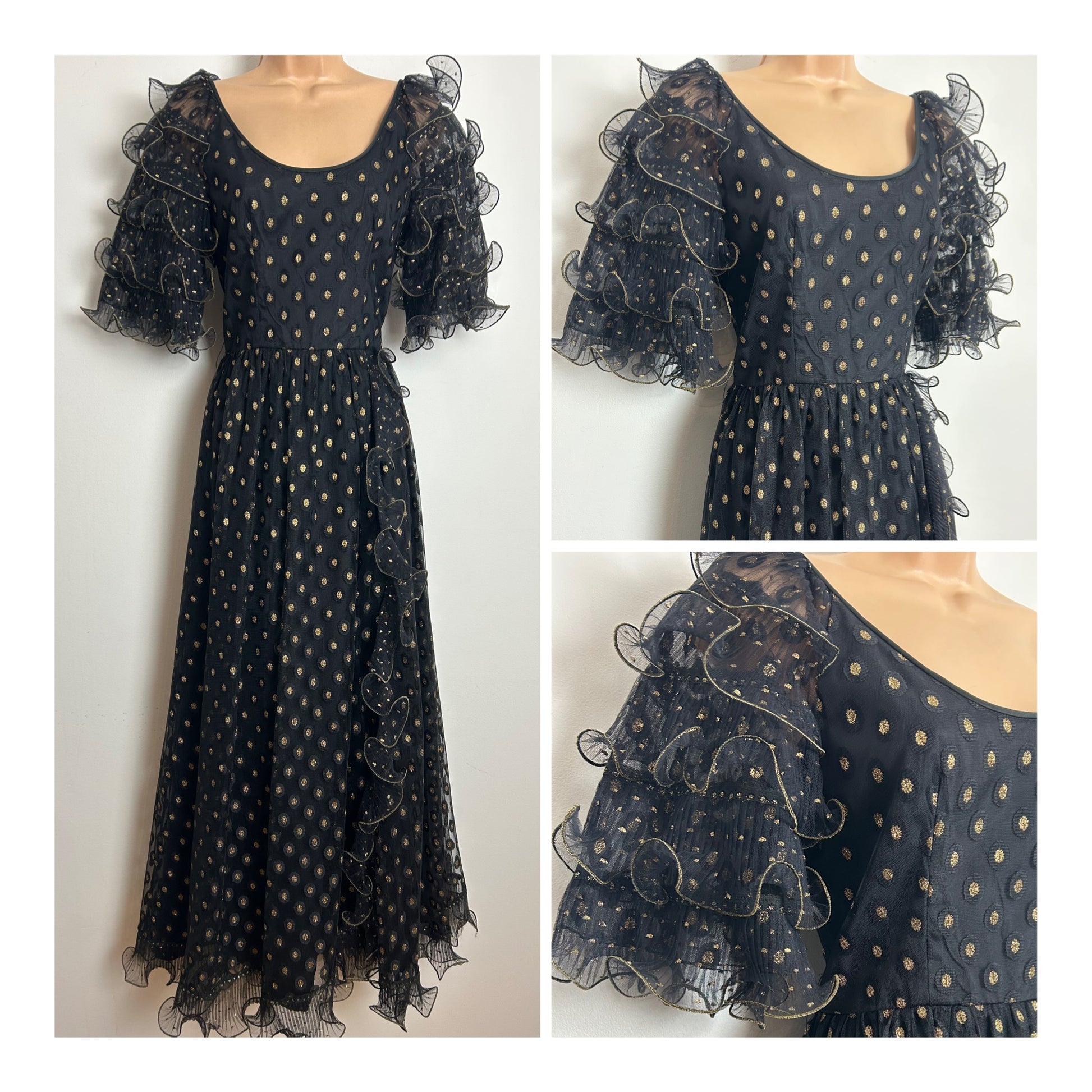 Vintage Late 1970s JOHN CHARLES Size 8 Black & Gold Spot Pattern Ruffle Sleeve Evening Maxi Dress