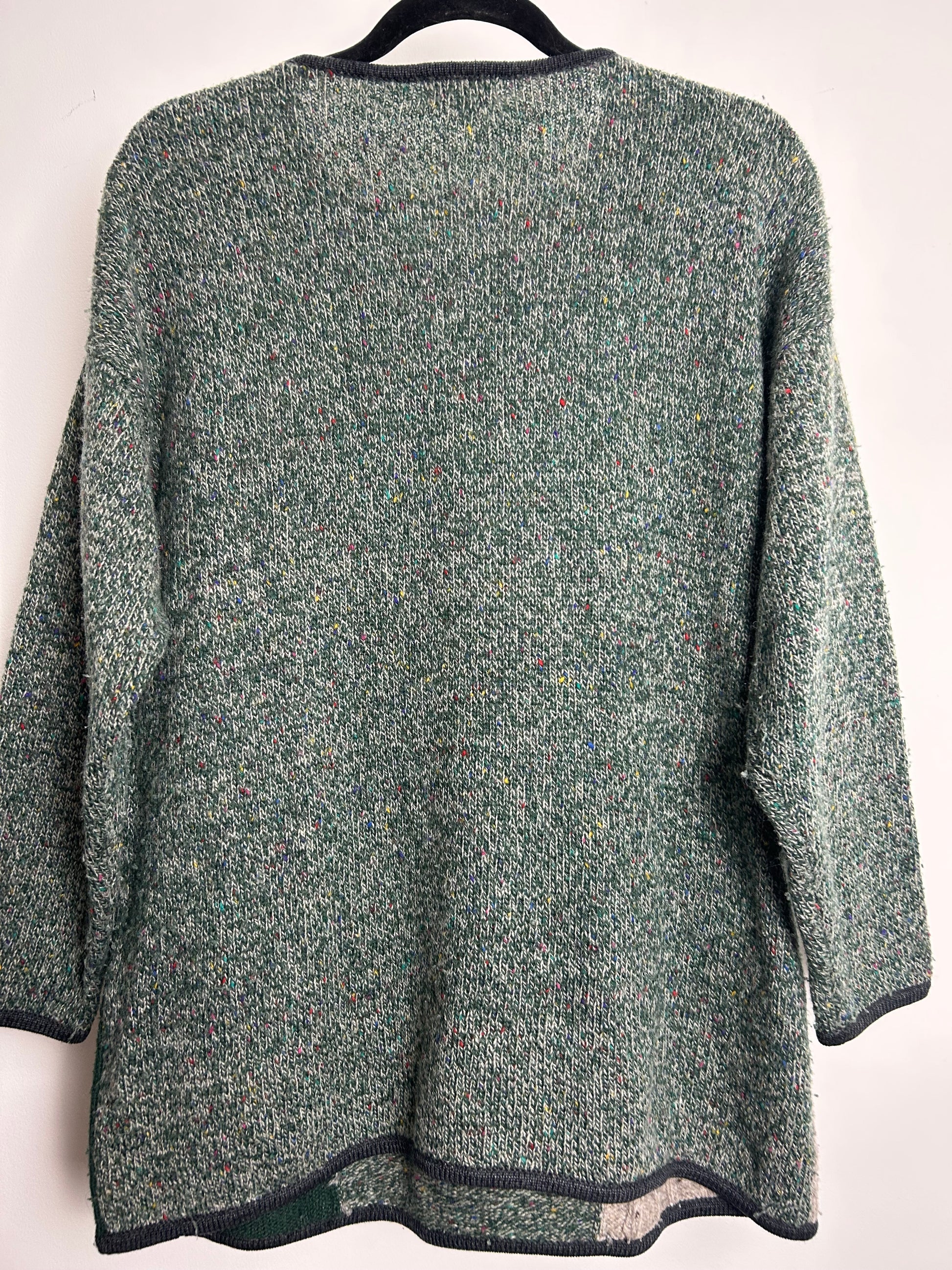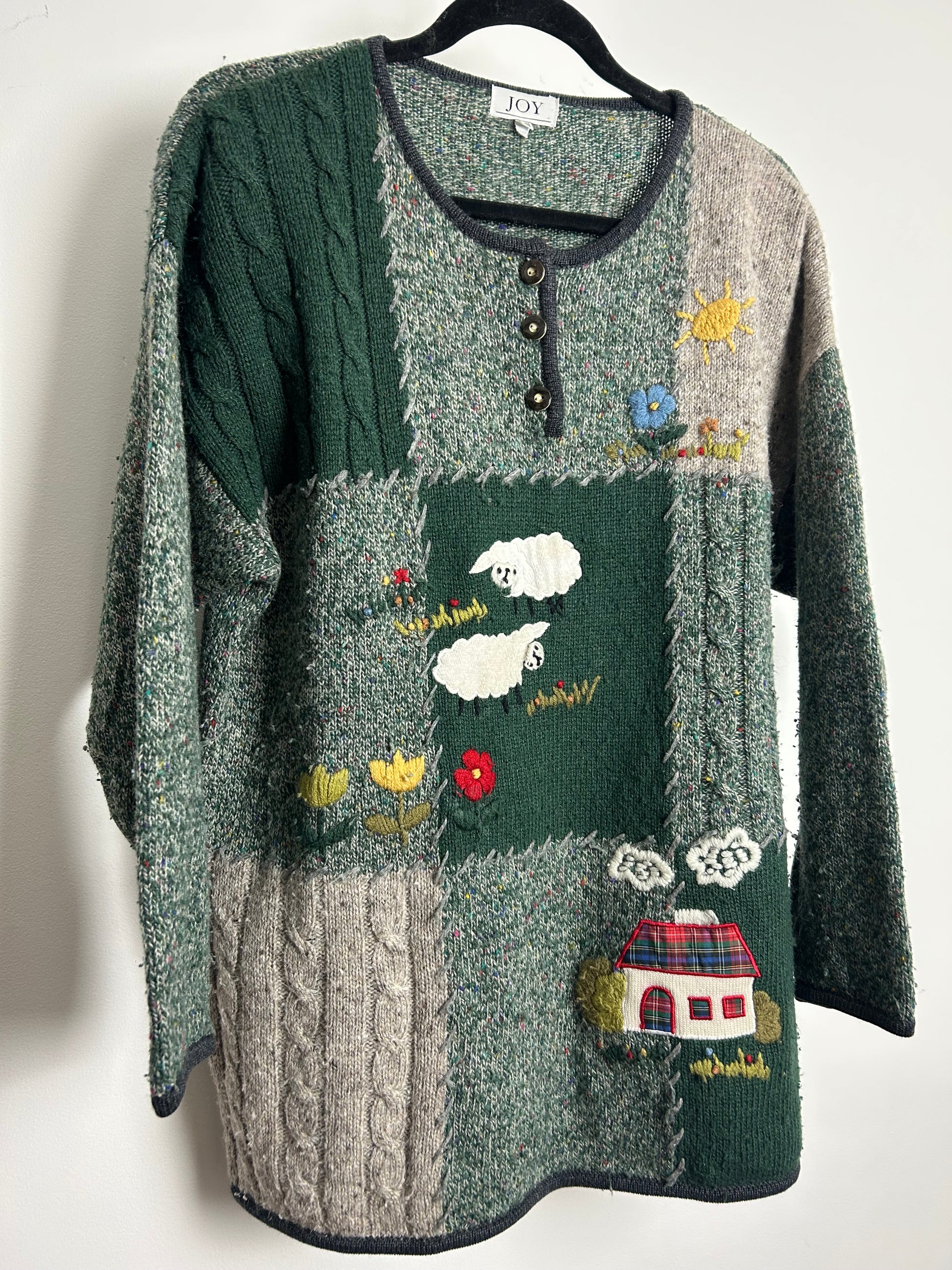 Vintage 1980s JOY Size 14/16 Slouchy Green Sheep Flowers & Cottage Applique Wool Mix Jumper