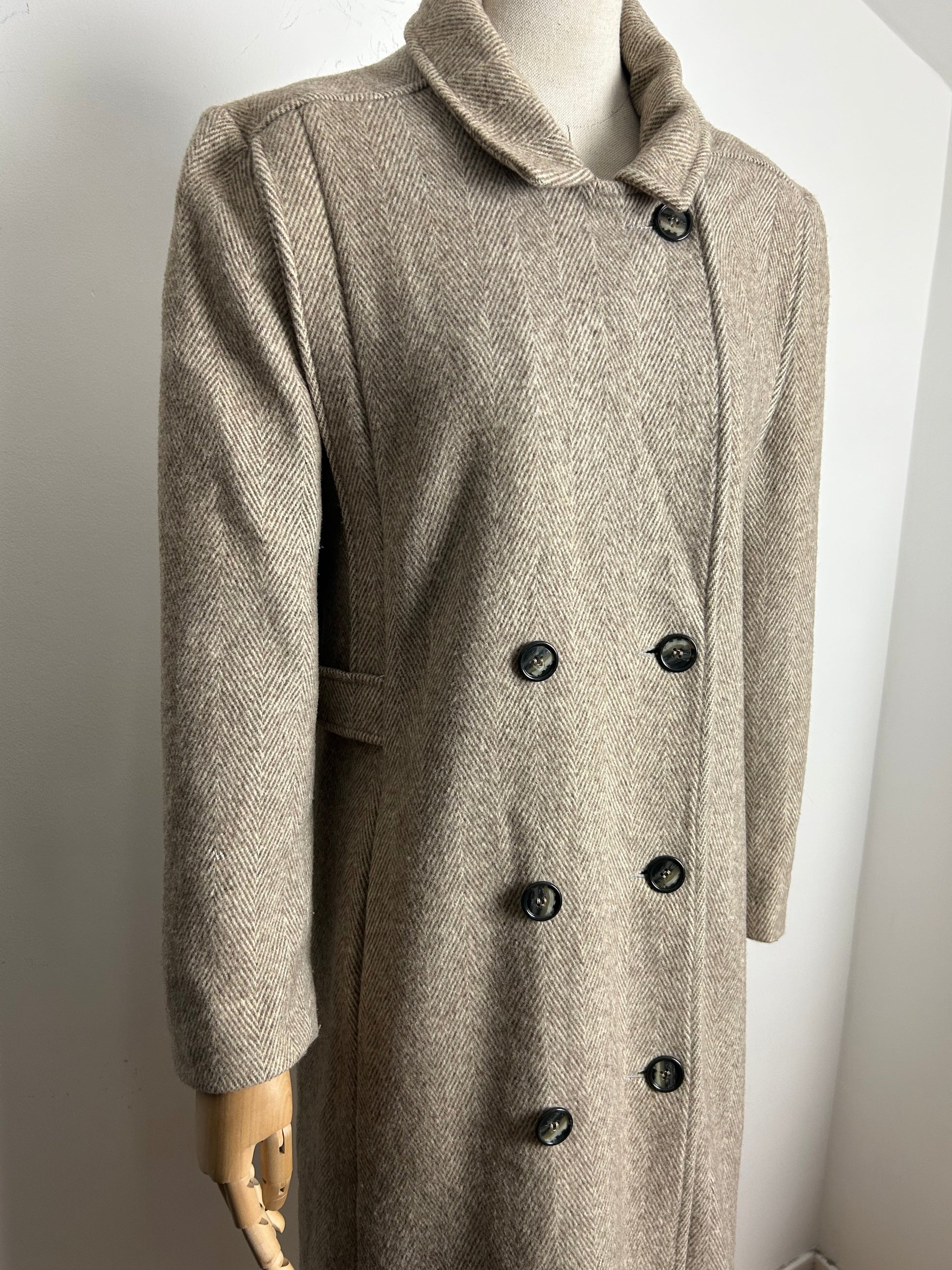 Vintage Early 1980s NOBLE FASHIONS UK Size 12-14 Beige Herringbone Pure New Wool Double Breasted Winter Coat