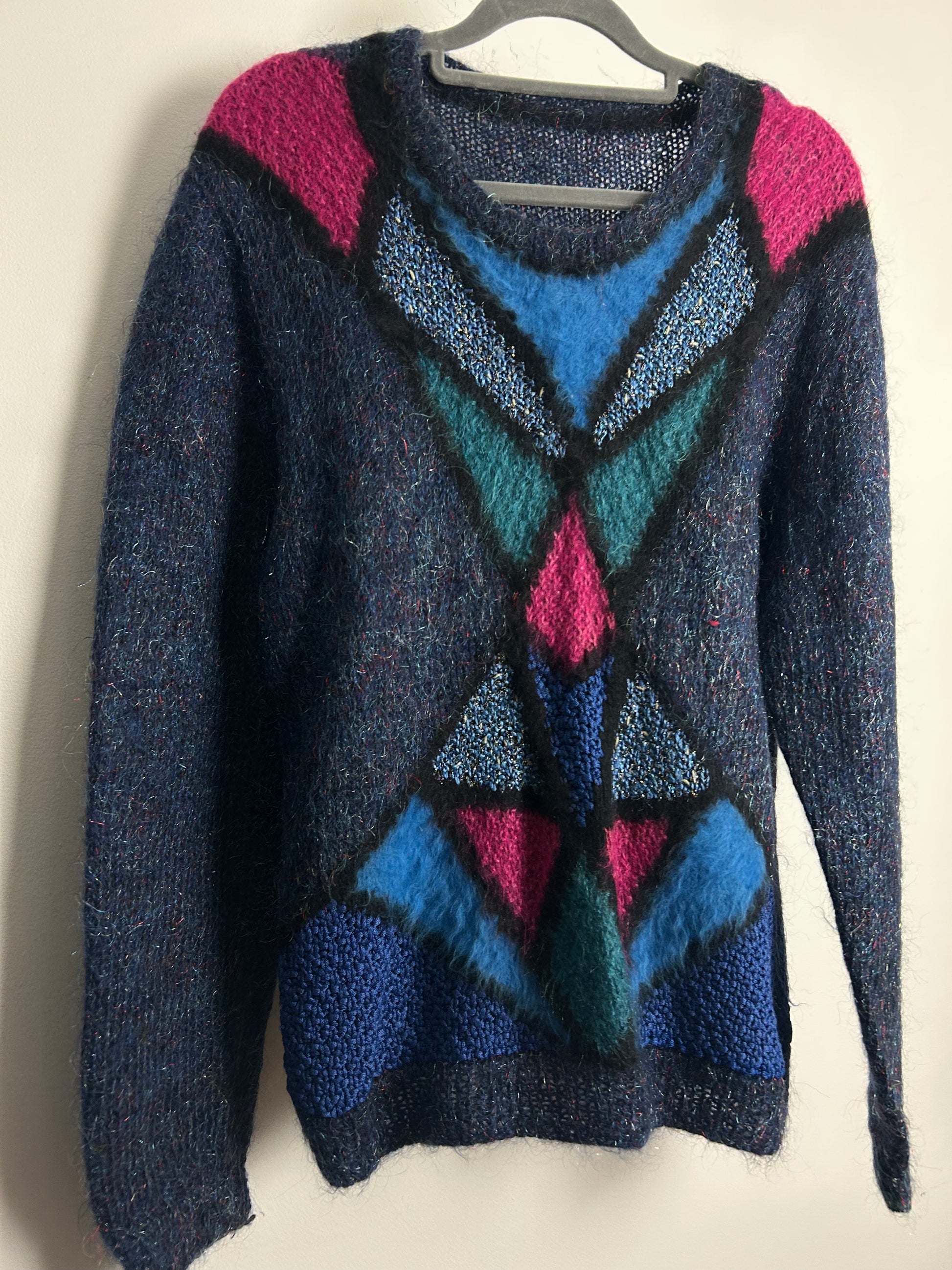 Vintage 1980s One Size Up To Size 16 Blue Pink & Teal Geo Pattern Jumper