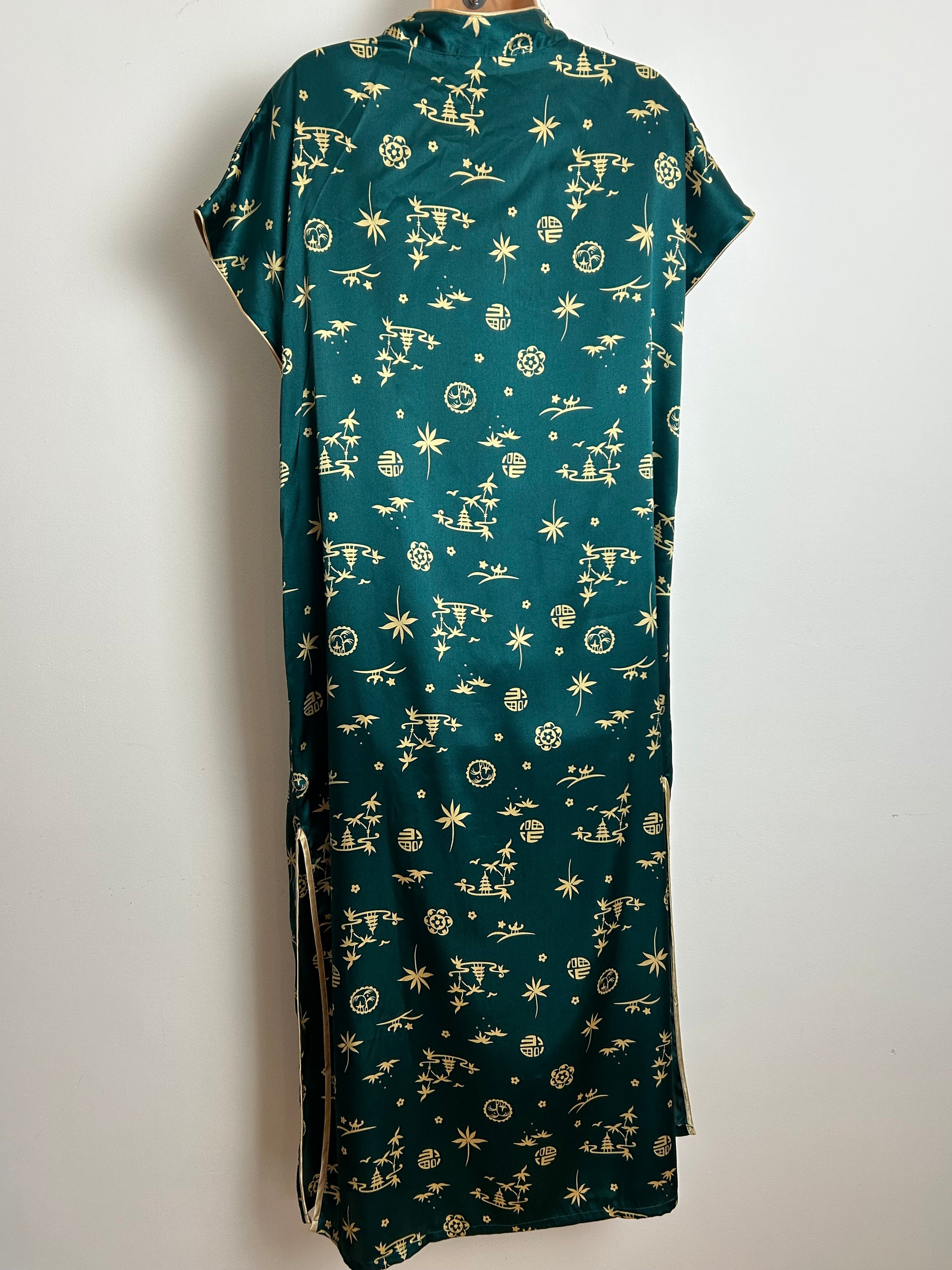 This lovely vintage kaftan is made from a lovely soft silky sateen 100% polyester fabric in dark green & pale gold Japanese pagoda print.