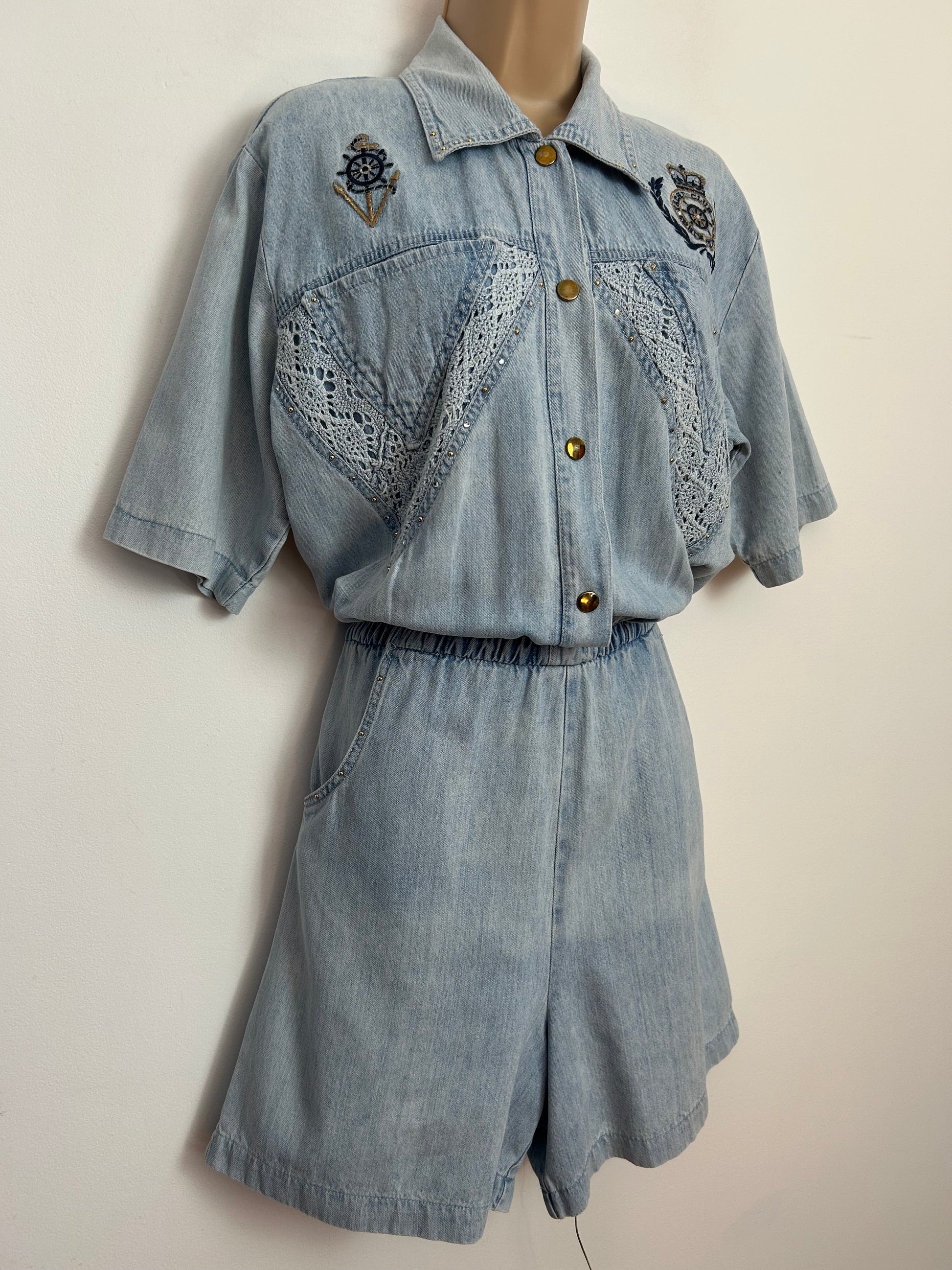 Vintage 1980s RARE ST DENIS Size 12 Pale Stonewash Denim Nautical Applique Detail Playsuit