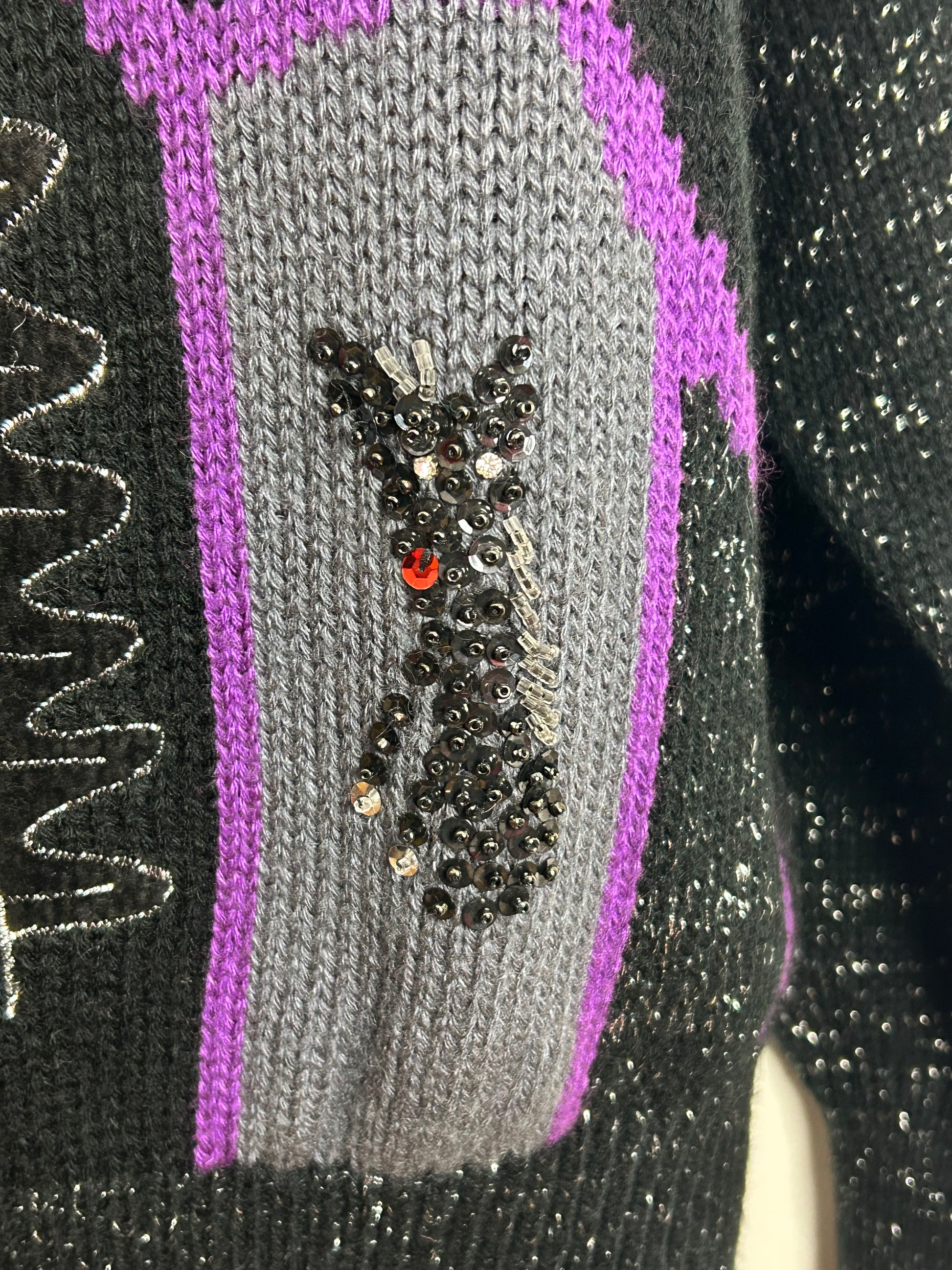Vintage 1980s SANTAS Up To Size 16 Black Purple & Silver Lurex Sequin Cat Detail Jumper