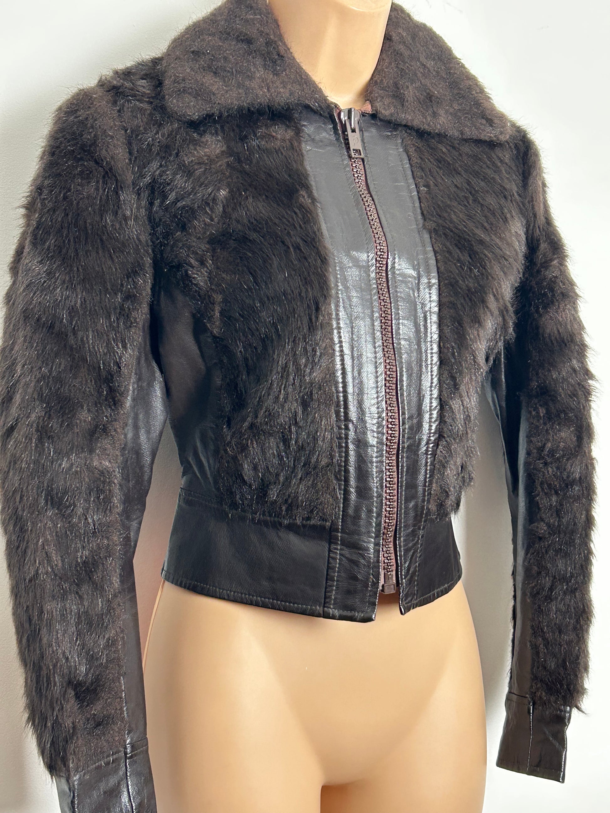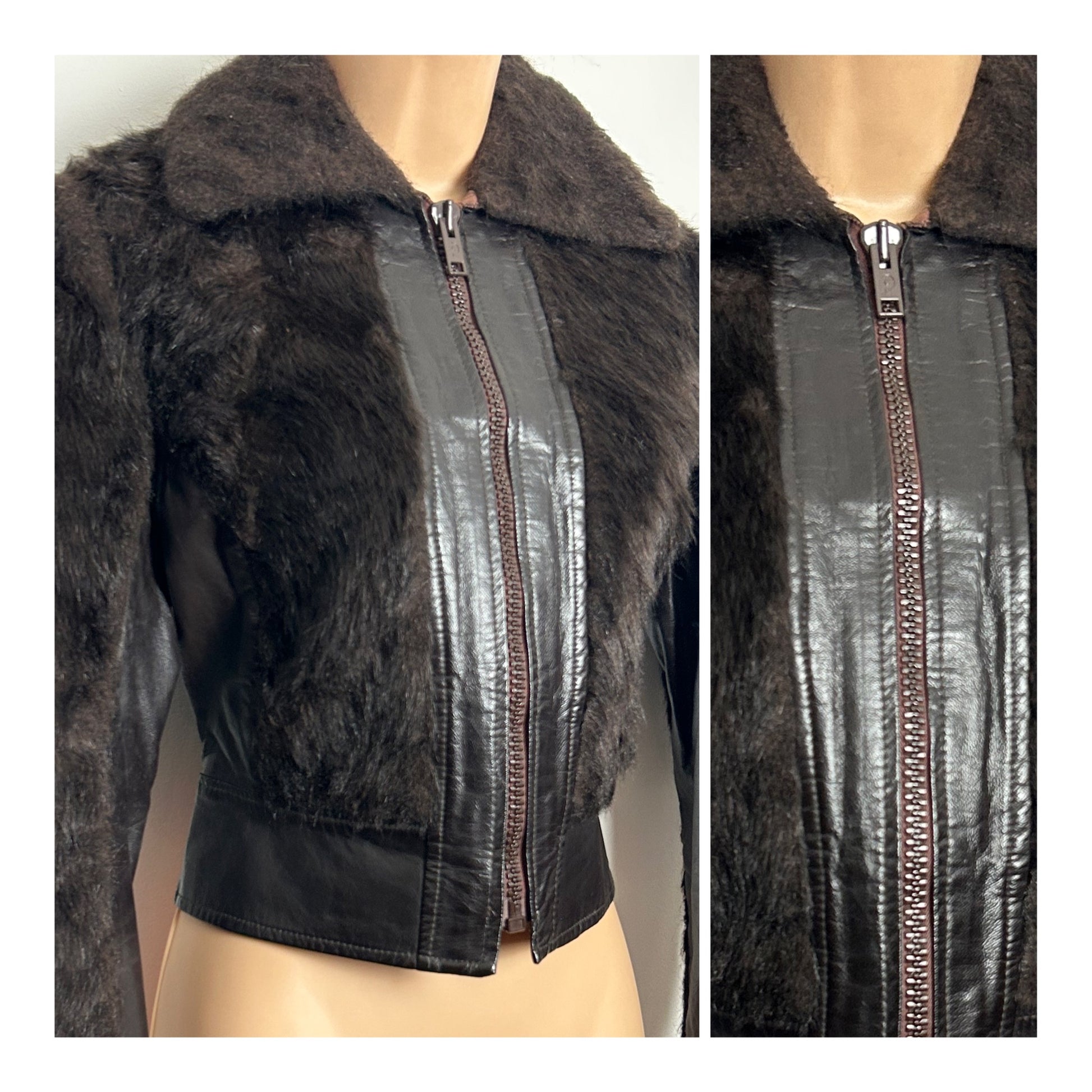 Vintage 1980s SCAN Size 10 Brown Faux Leather & Faux Fur Cropped Zip Up Jacket
