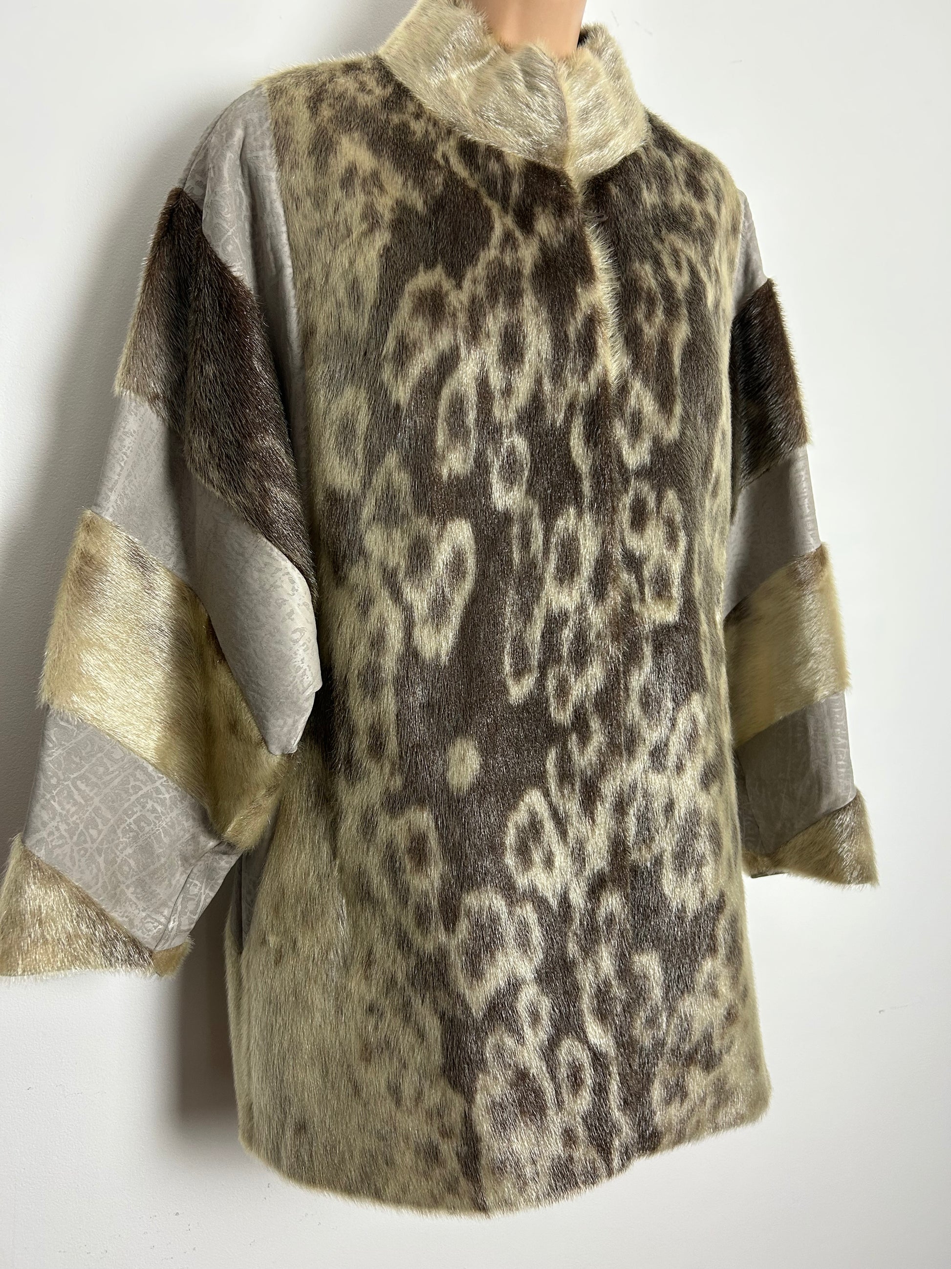Vintage 1980s SCHRADER Size 12 Beige & Brown Tones Suede & Fur Animal Print Oversize Jacket