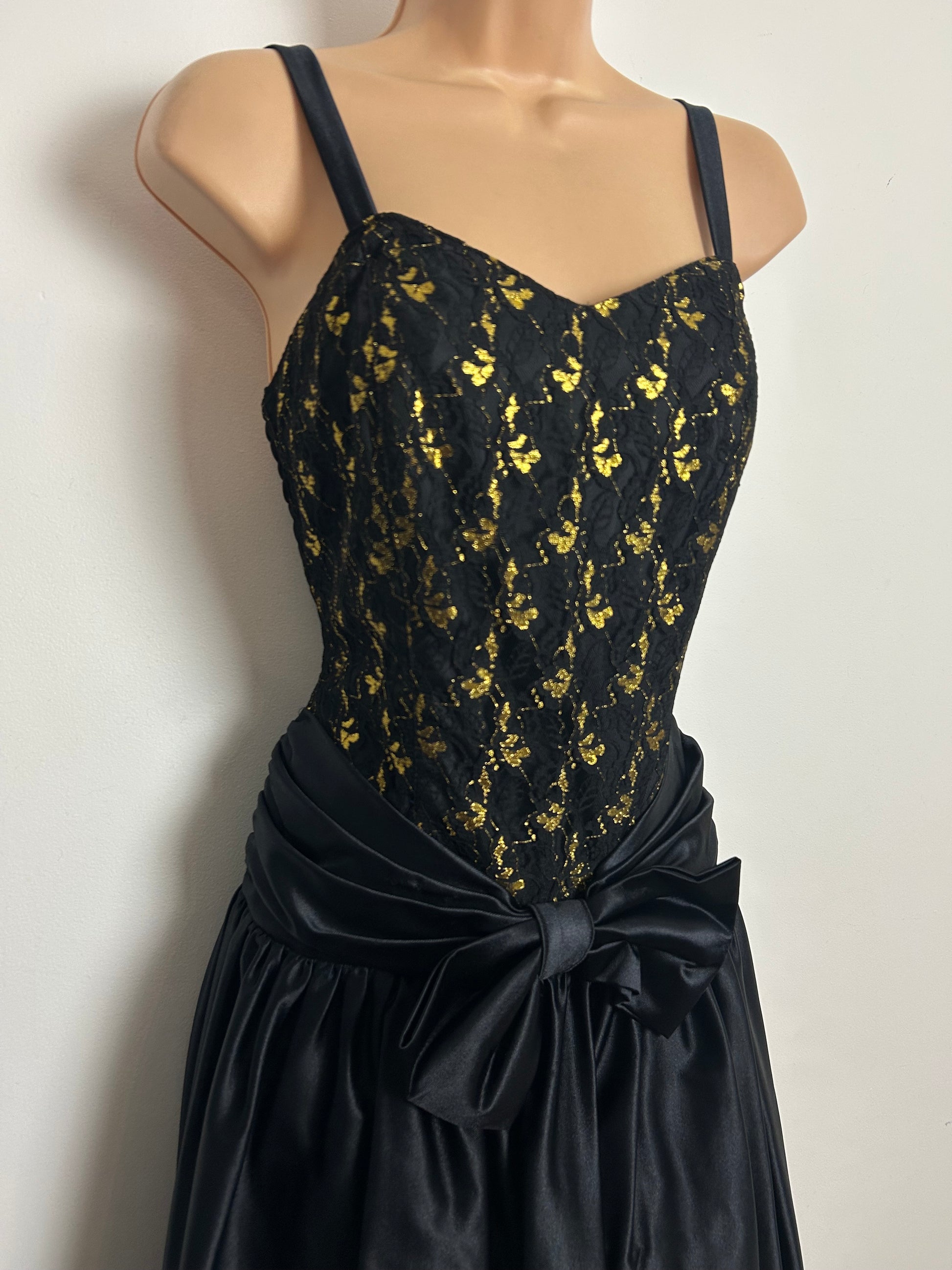 Vintage 1980s Size 10 Black & Metallic Gold Lace Bodice Party Prom Dress