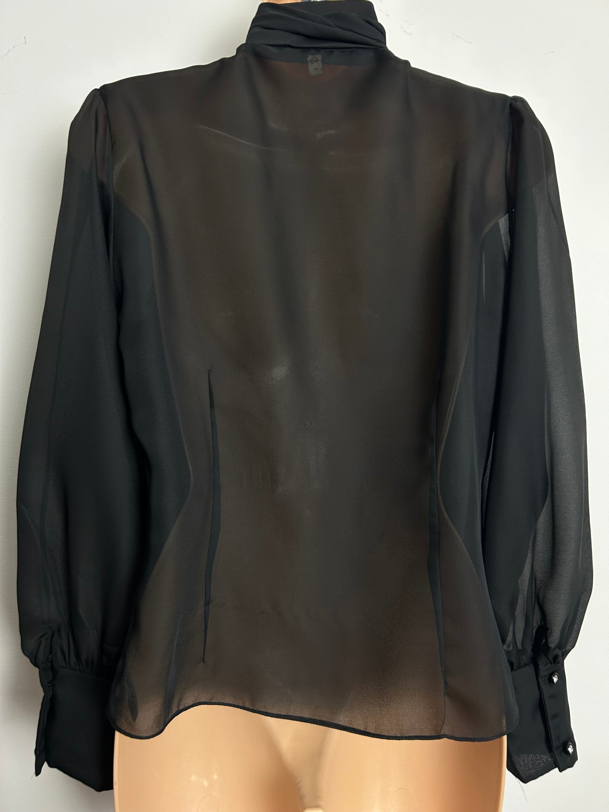 This lovely vintage blouse is made from a black chiffon polyester fabric. It is semi sheer and unlined.