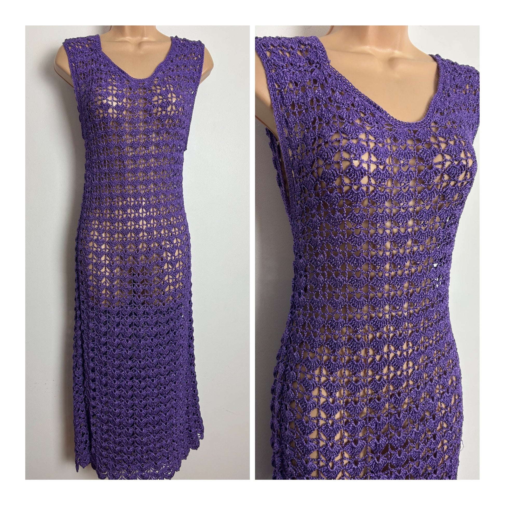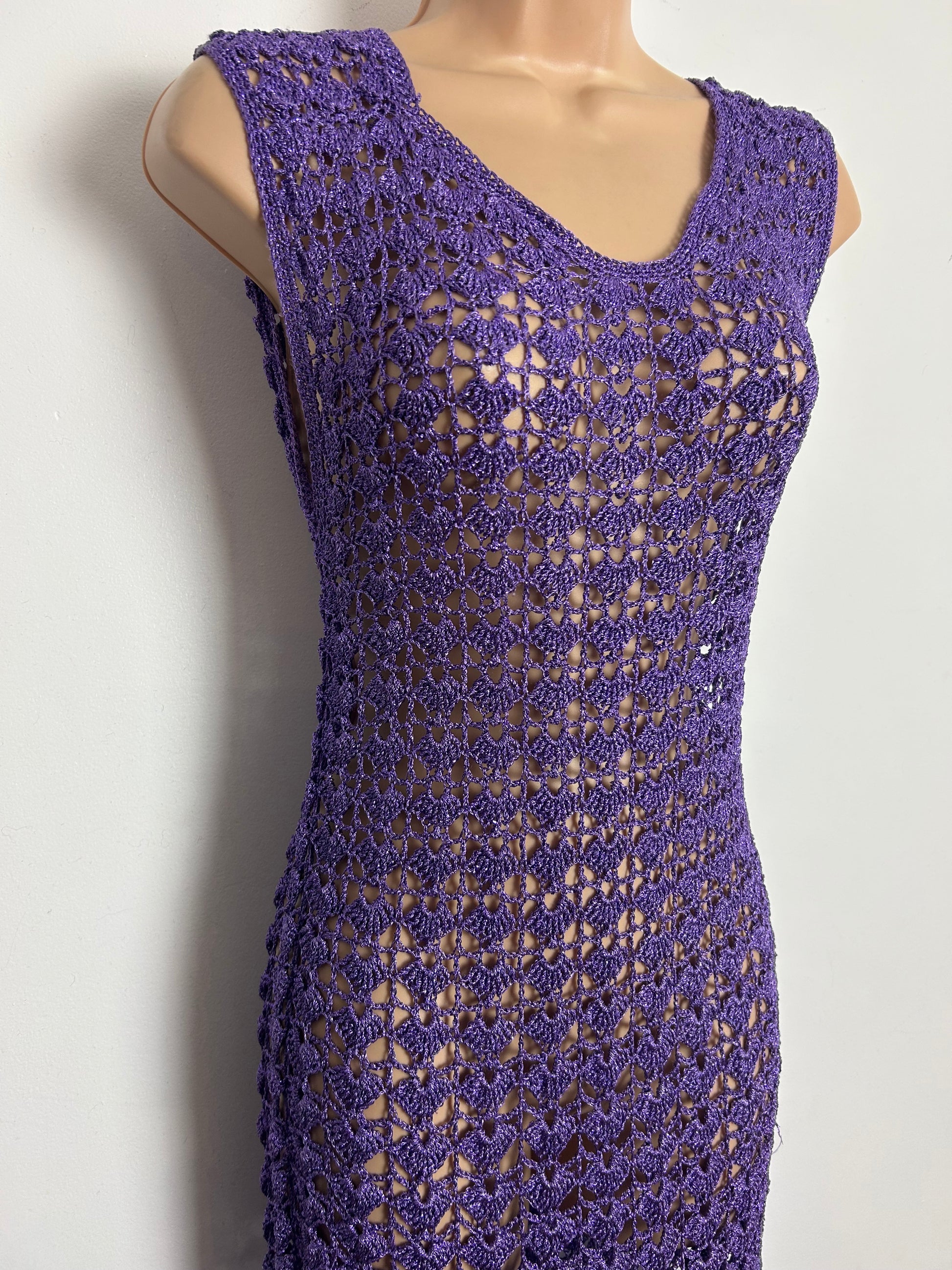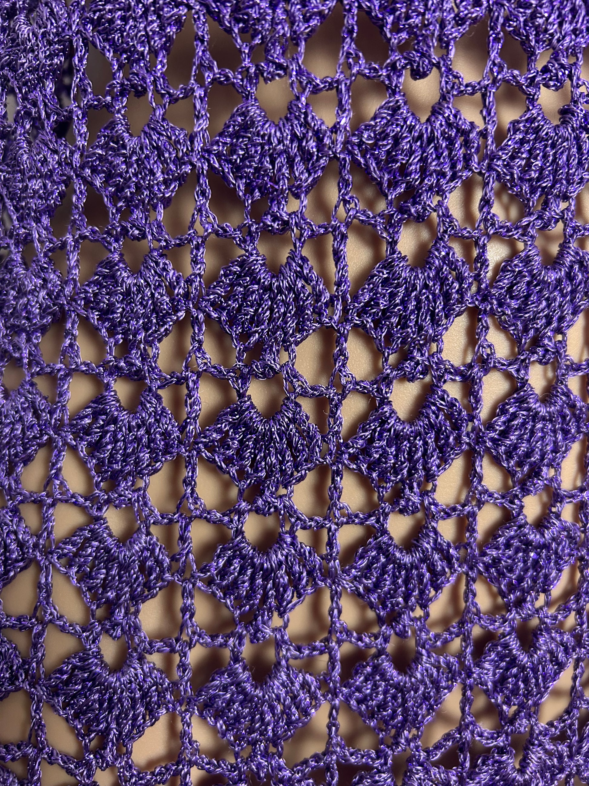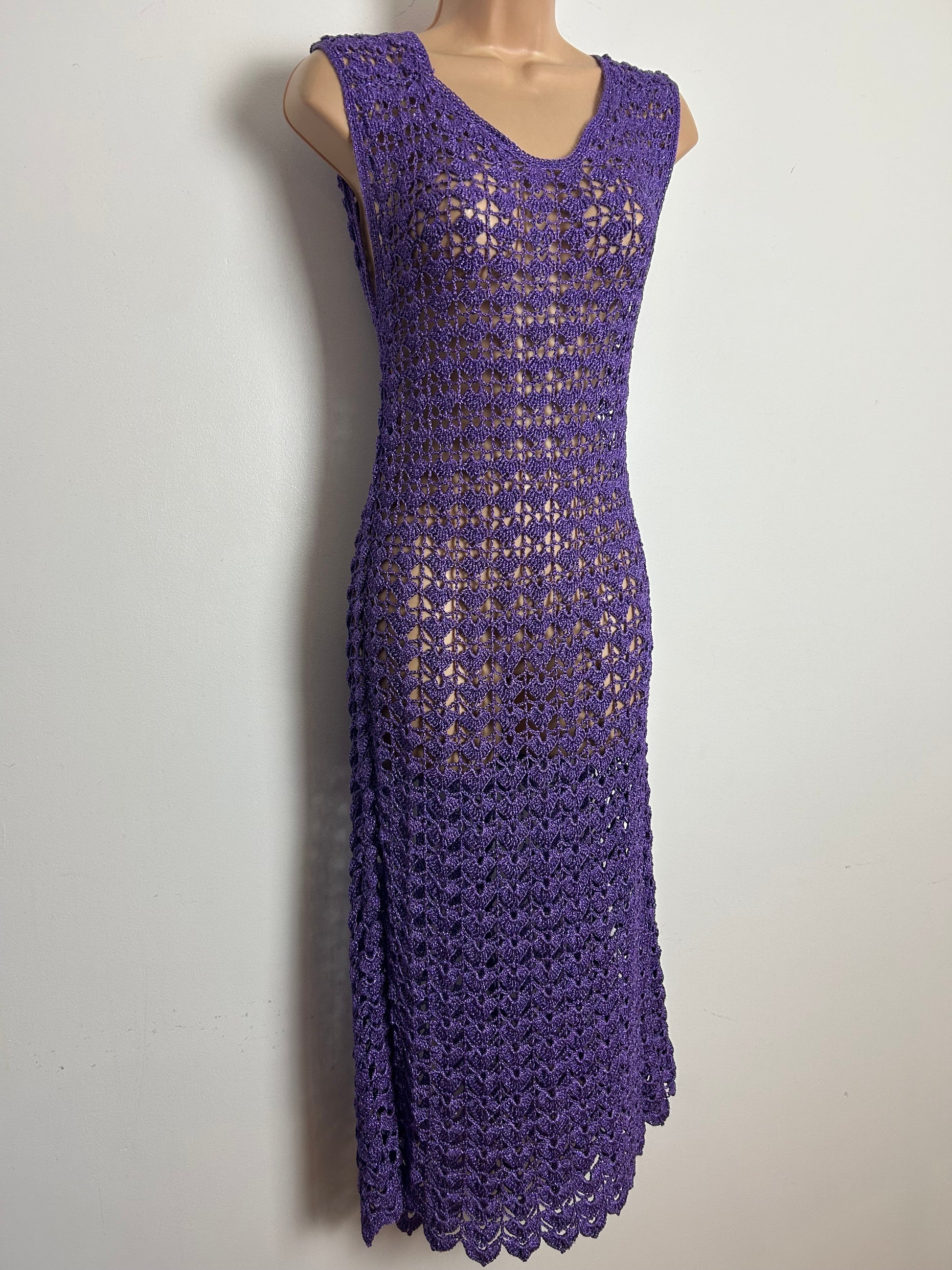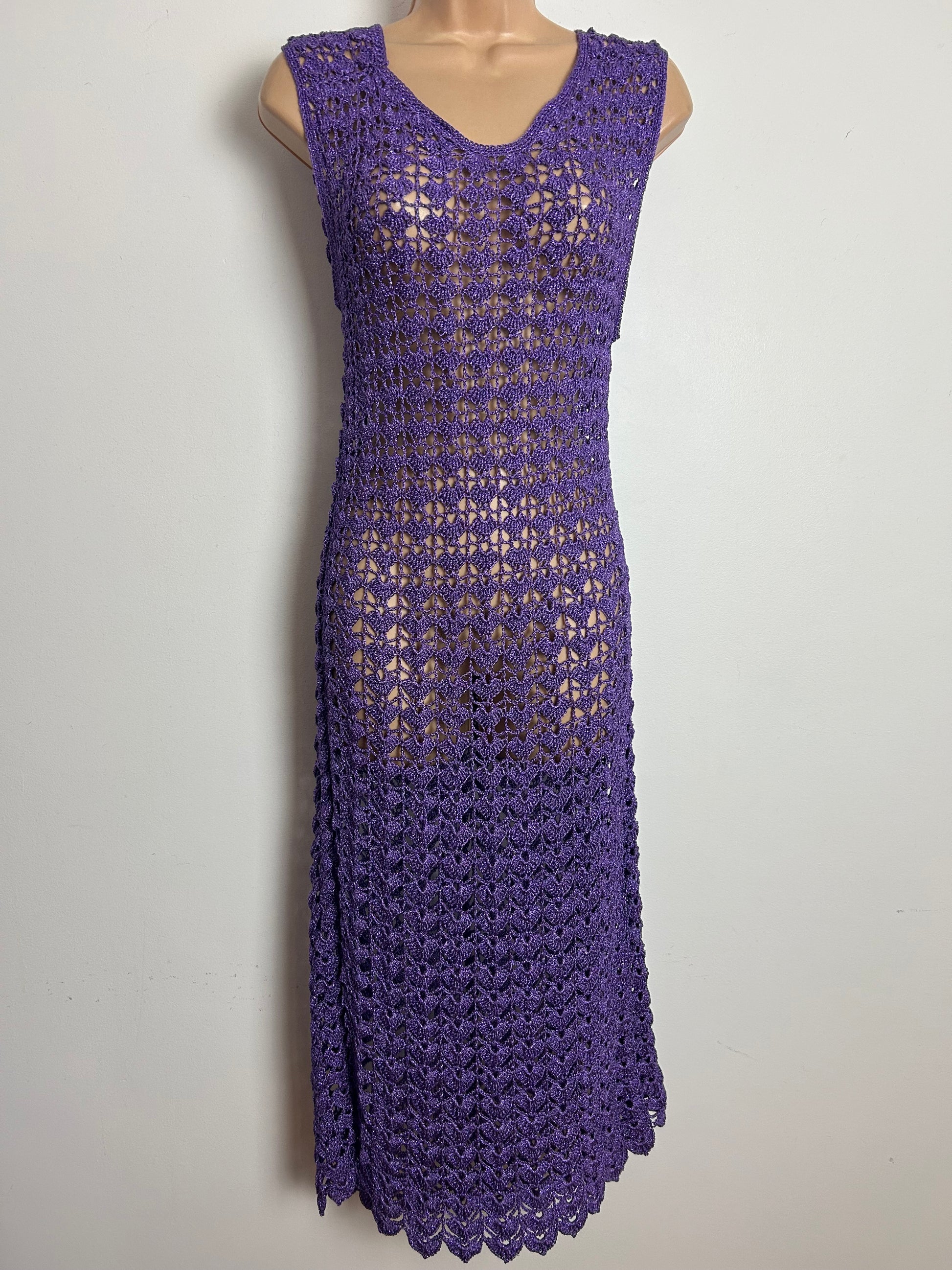 This lovely vintage crochet dress is a lovely purple with metallic shimmer to it.