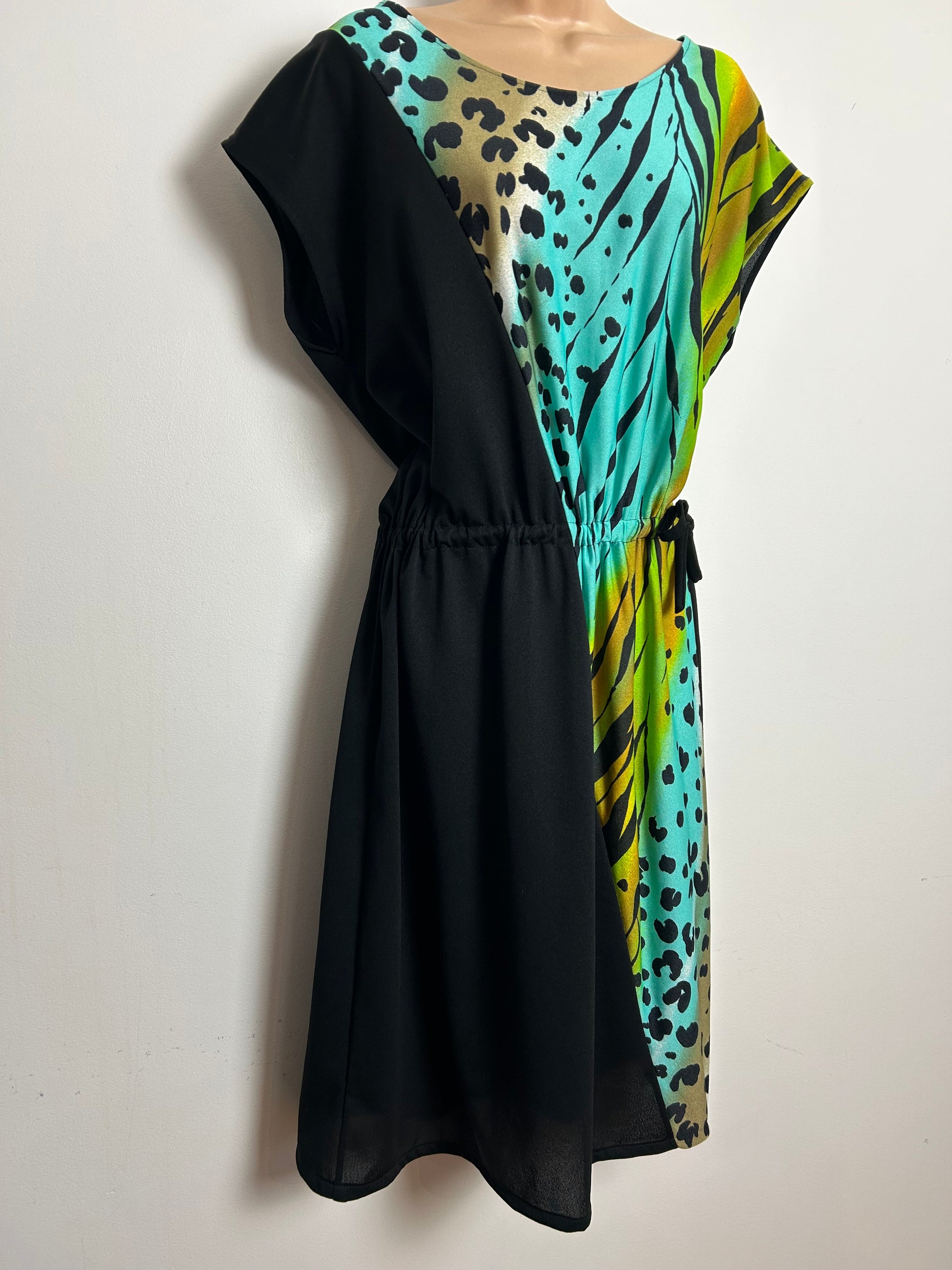 Vintage 1980s Size 14 Black Green Turquoise & Beige Animal Print Pull Tie Day Dress