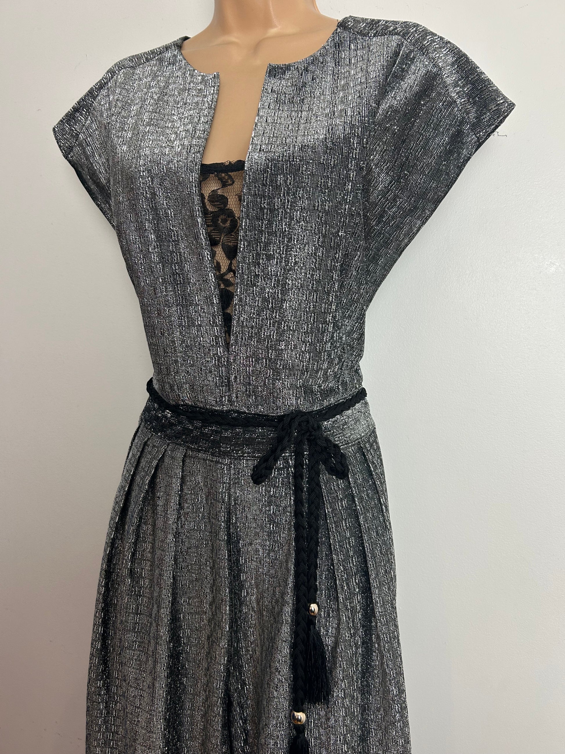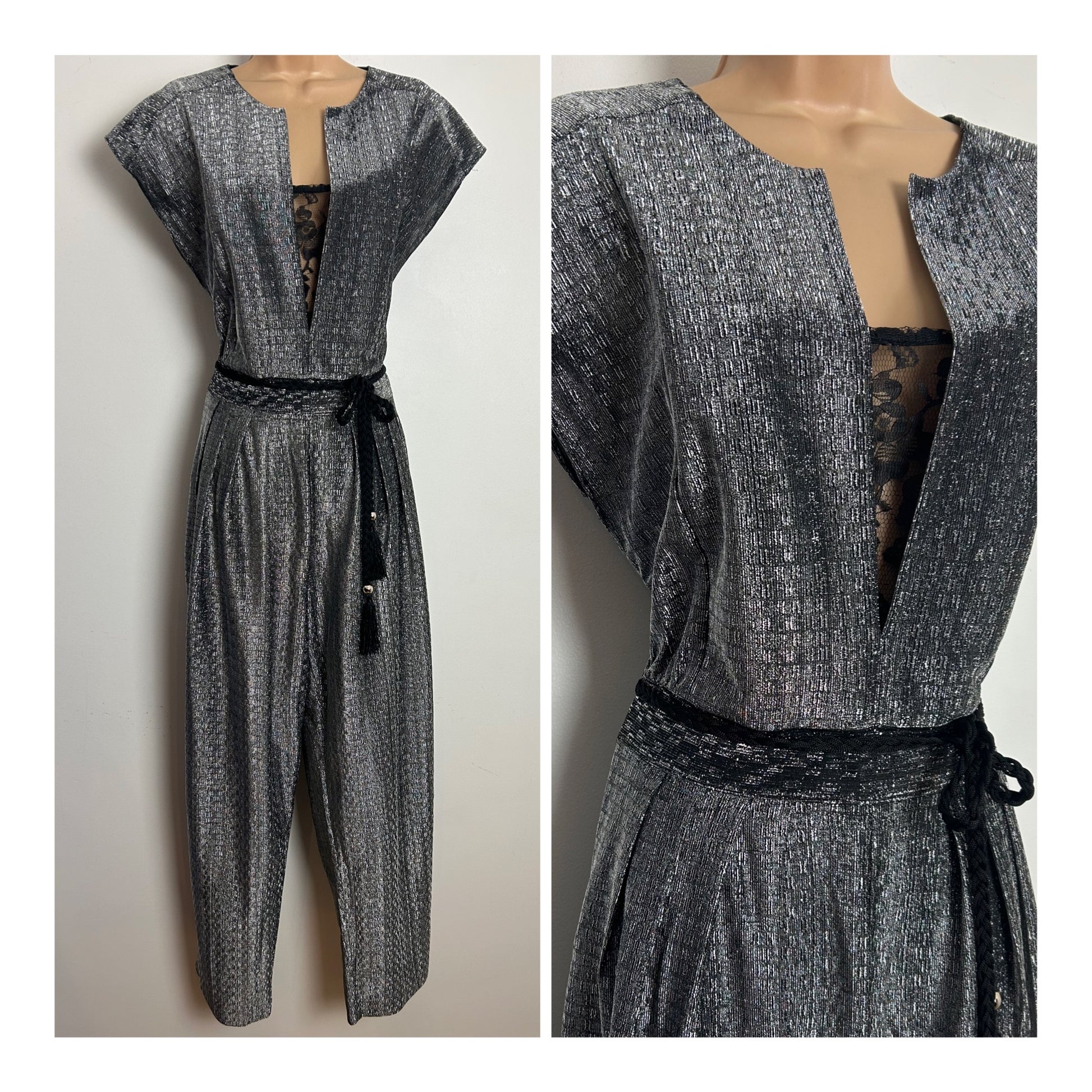 Vintage 1980s Size 14 Silver Metallic Silver Lurex Lace Panel Belted Xmas Party Evening Disco Jumpsuit