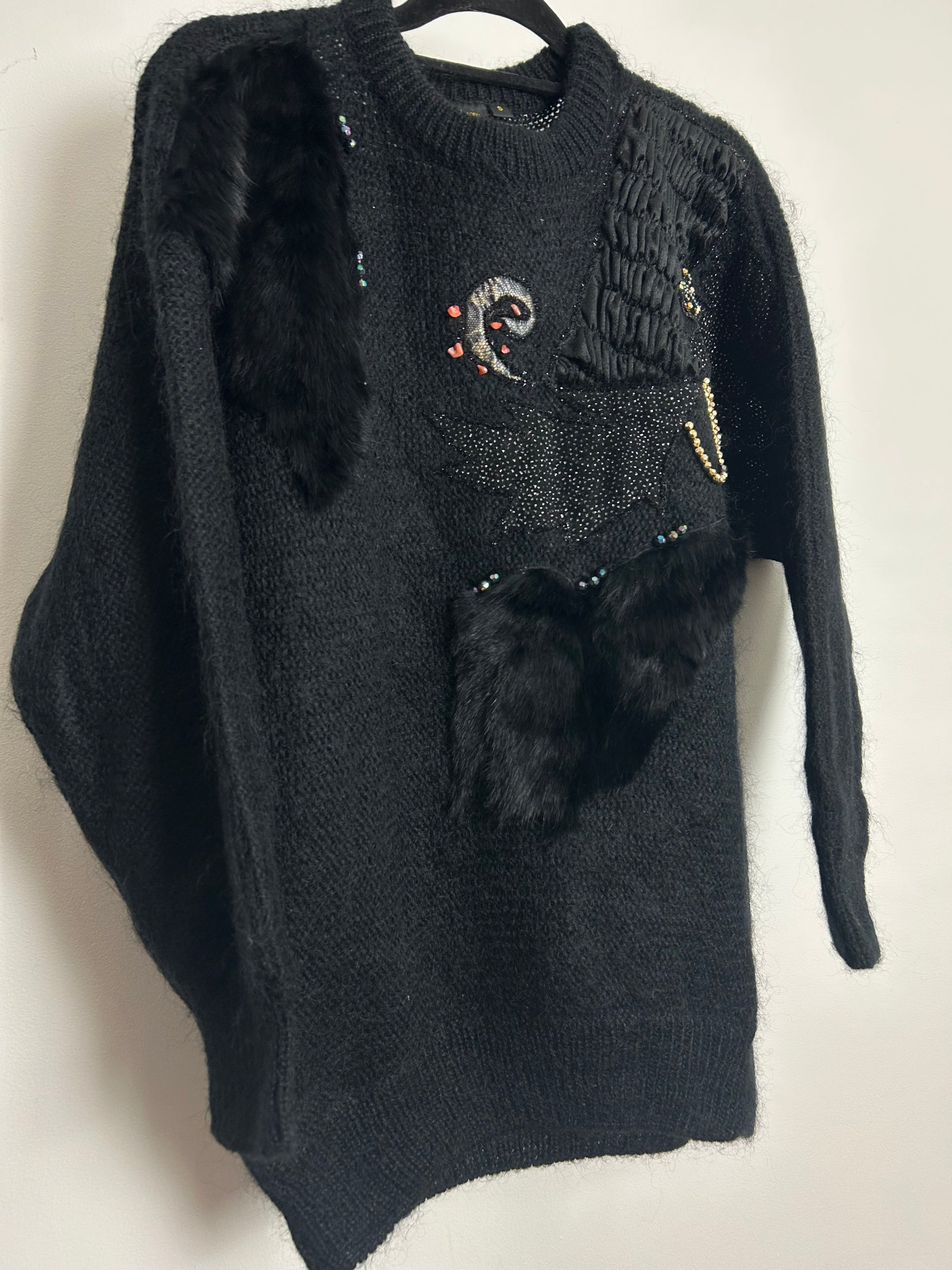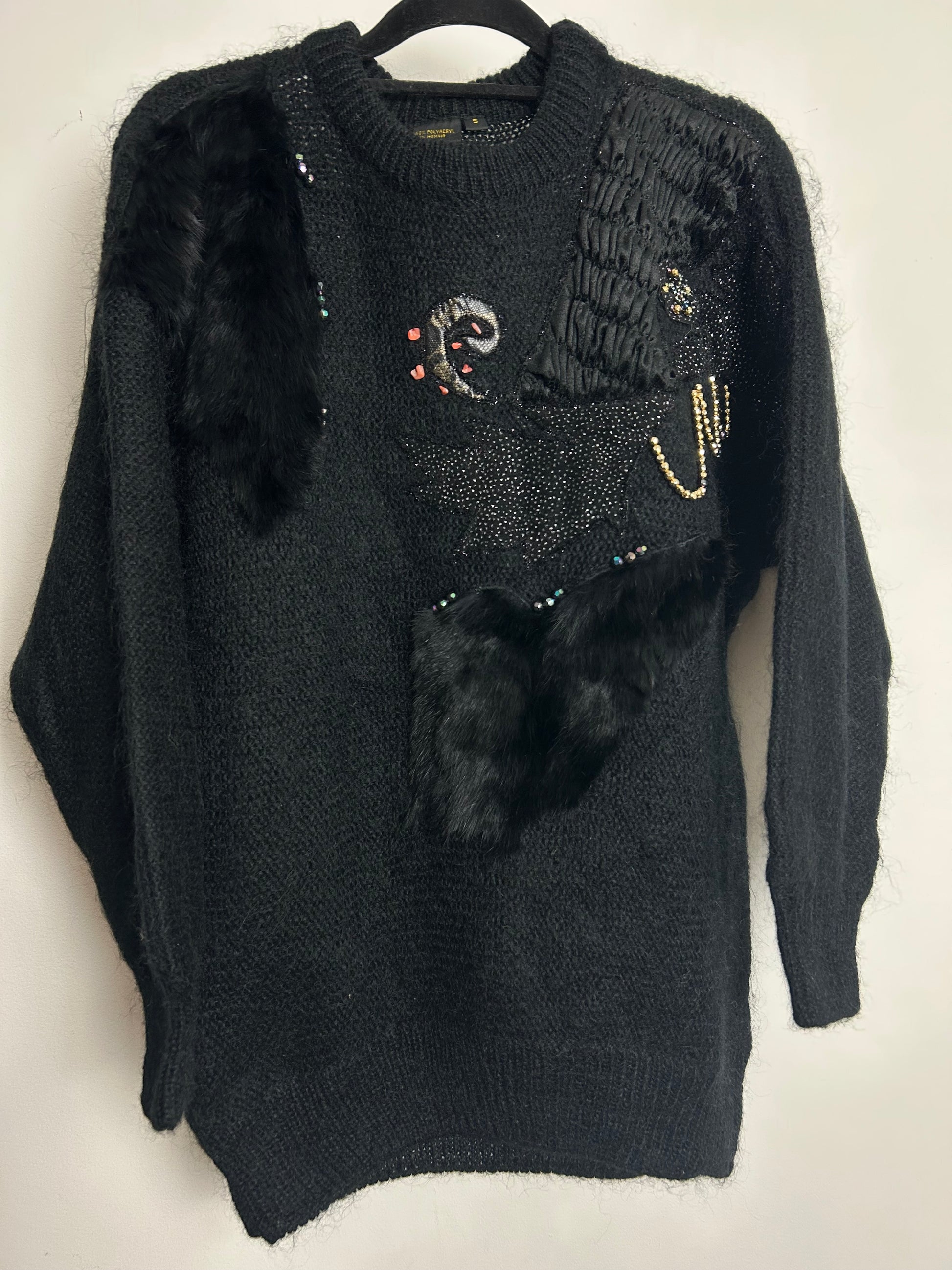 Vintage 1980s Up To Size 14 Black Fur Chain & Bead Applique Detail Slouchy Mohair Mix Jumper