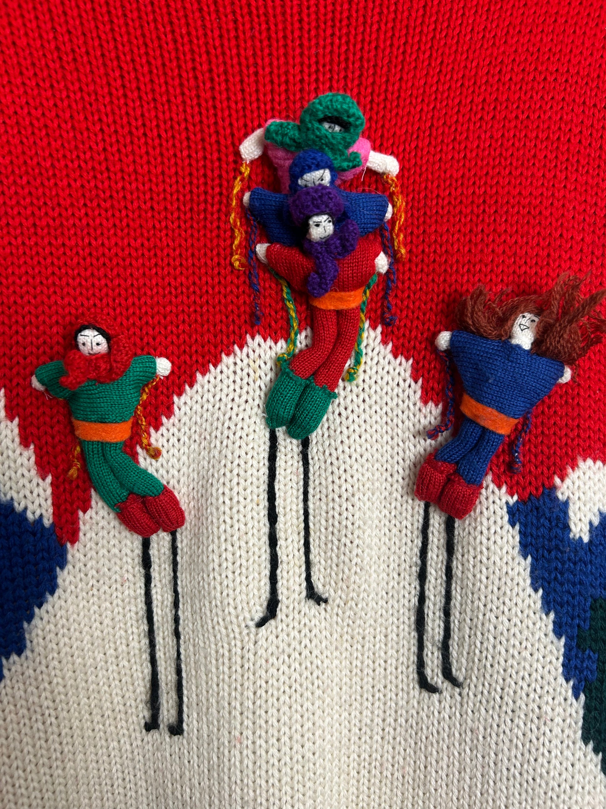 Vintage 1980s Up to Size 14 Super Cute Red & Cream Mountain Scene & 3D Skiing Jumper