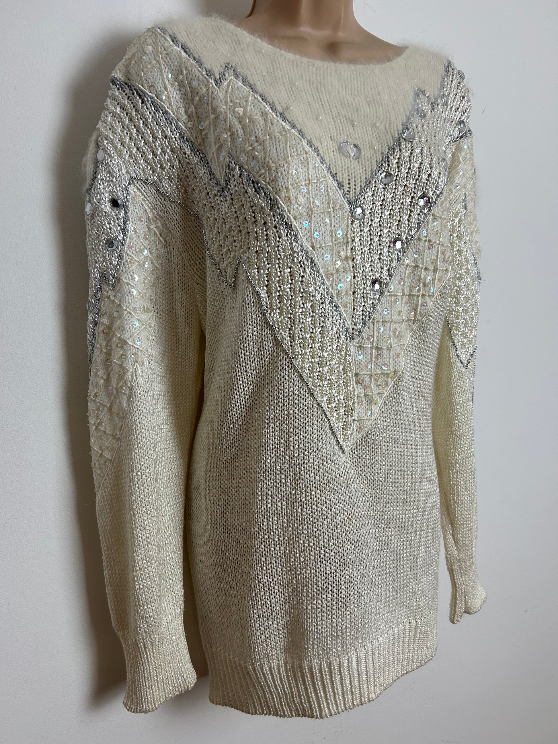 Vintage 1980s Up To Size 18-20 Winter White Sequin & Jewel Detail Winter Jumper
