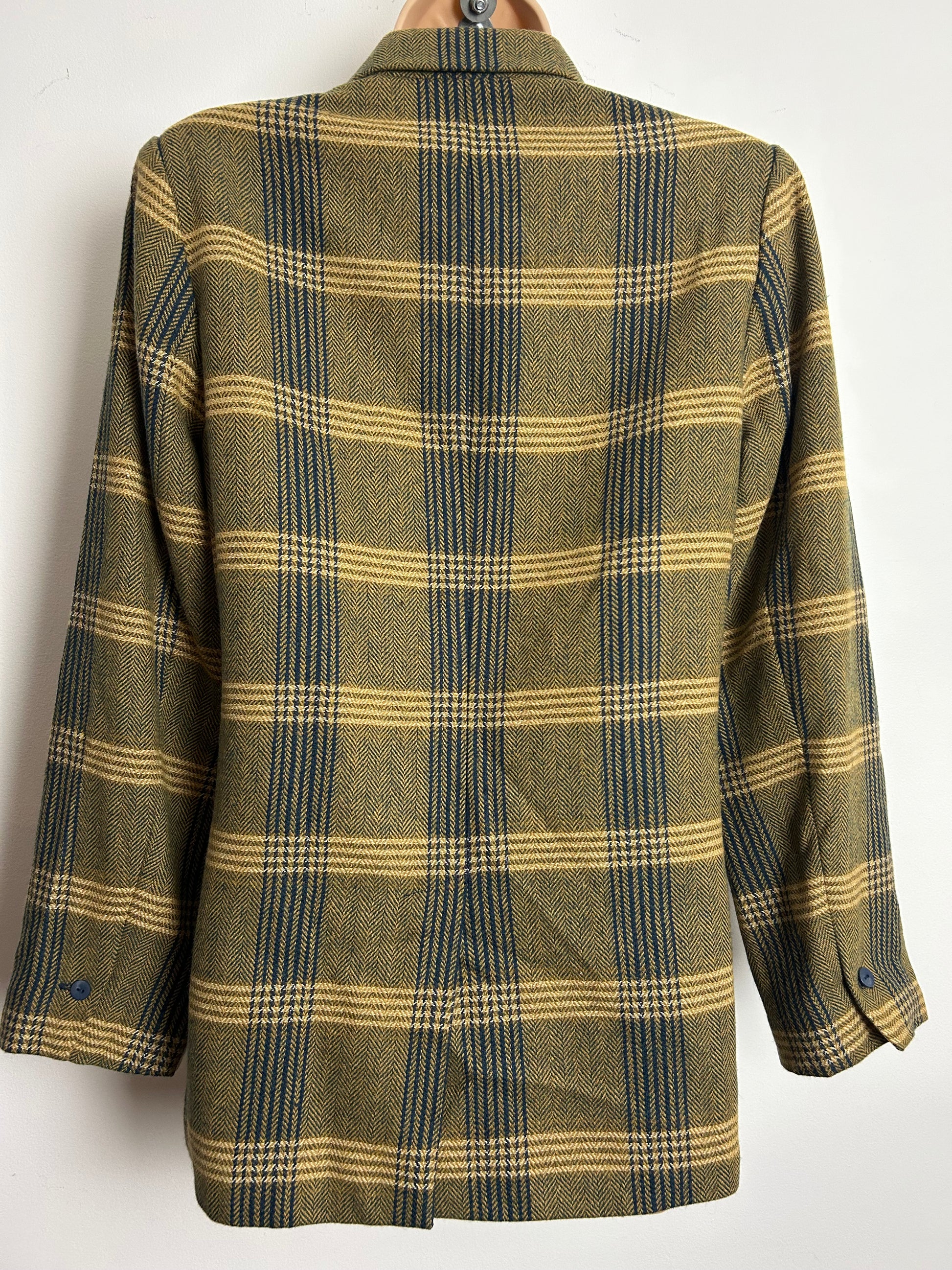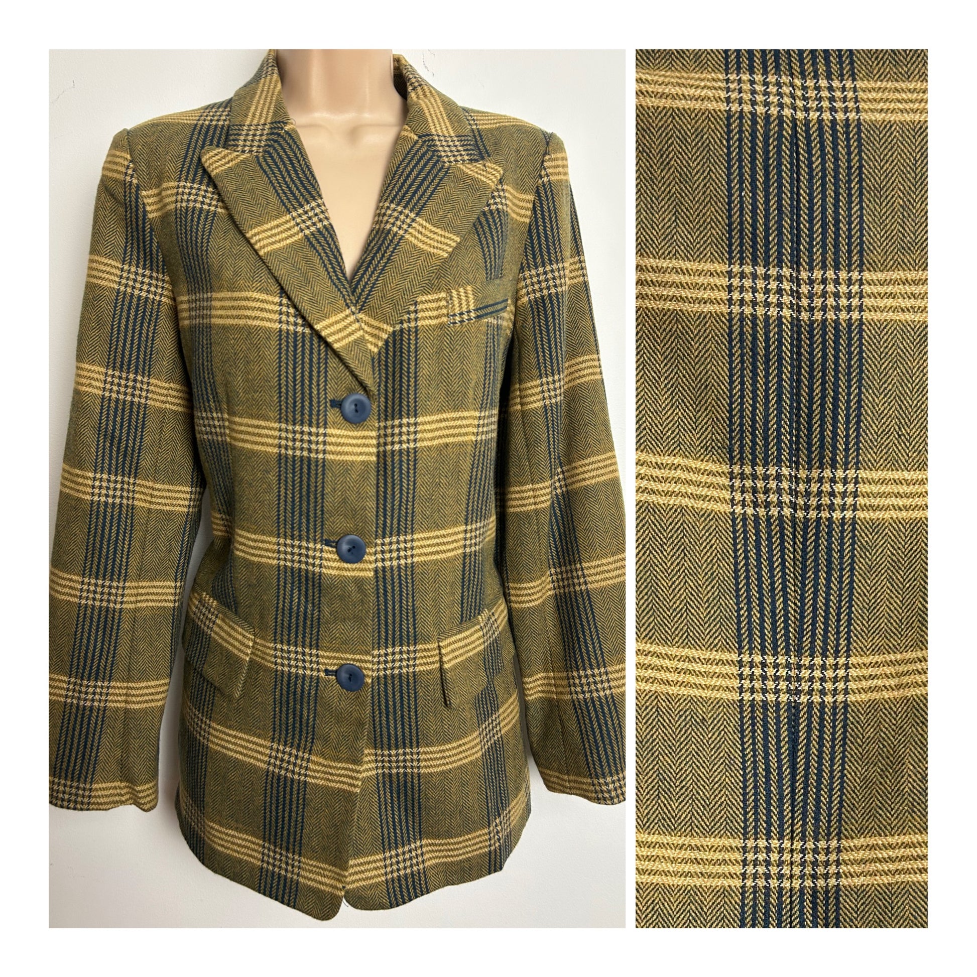 Vintage 1990s DANIEL RAINN Size S (10-12) Dark Beige & Navy Blue Check Print Wool Mix Blazer