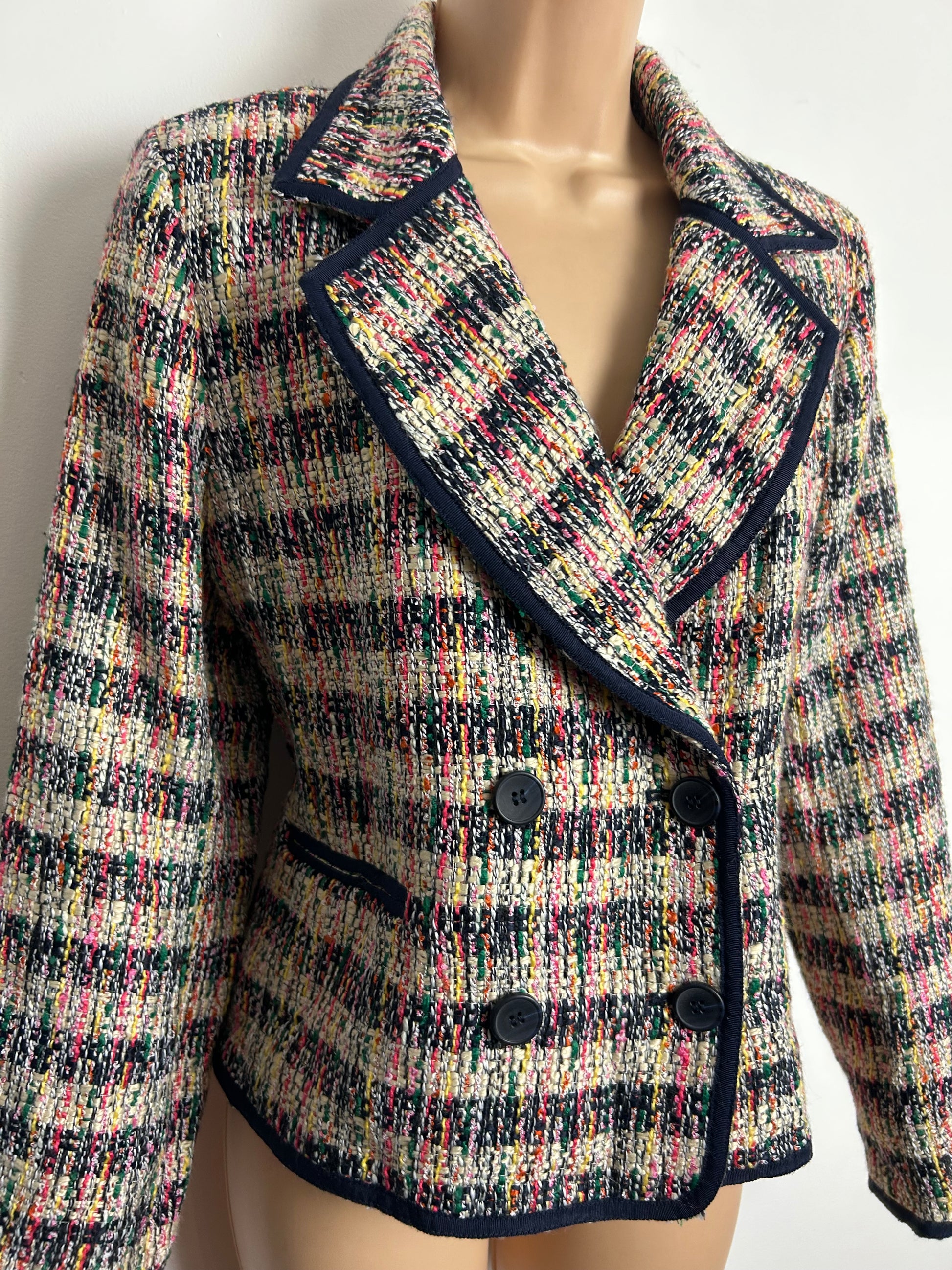 Vintage 1990s TALBOTS PETITE Size 12-14 Black Beige Green & Pink Tweed Double Breast Blazer