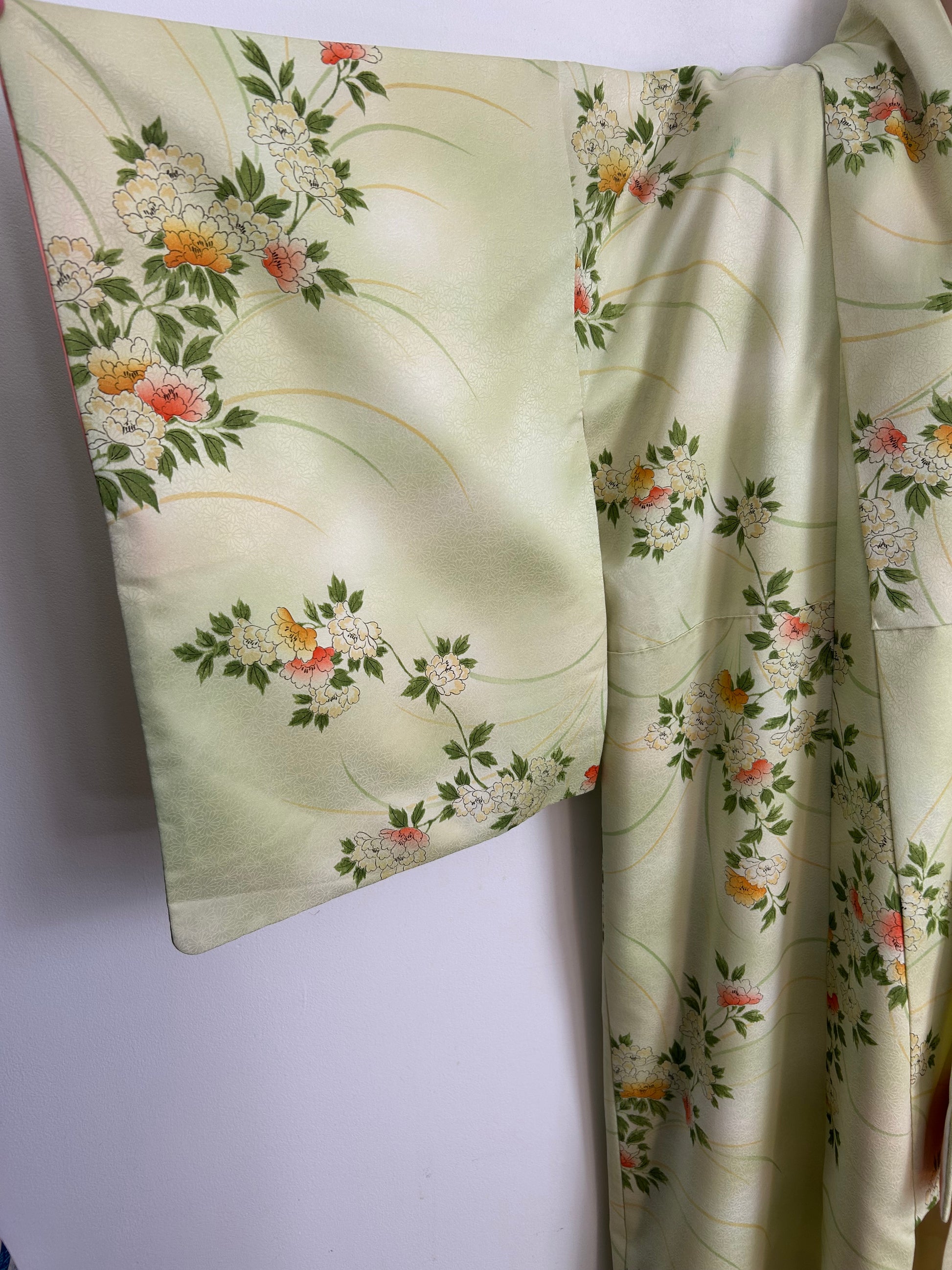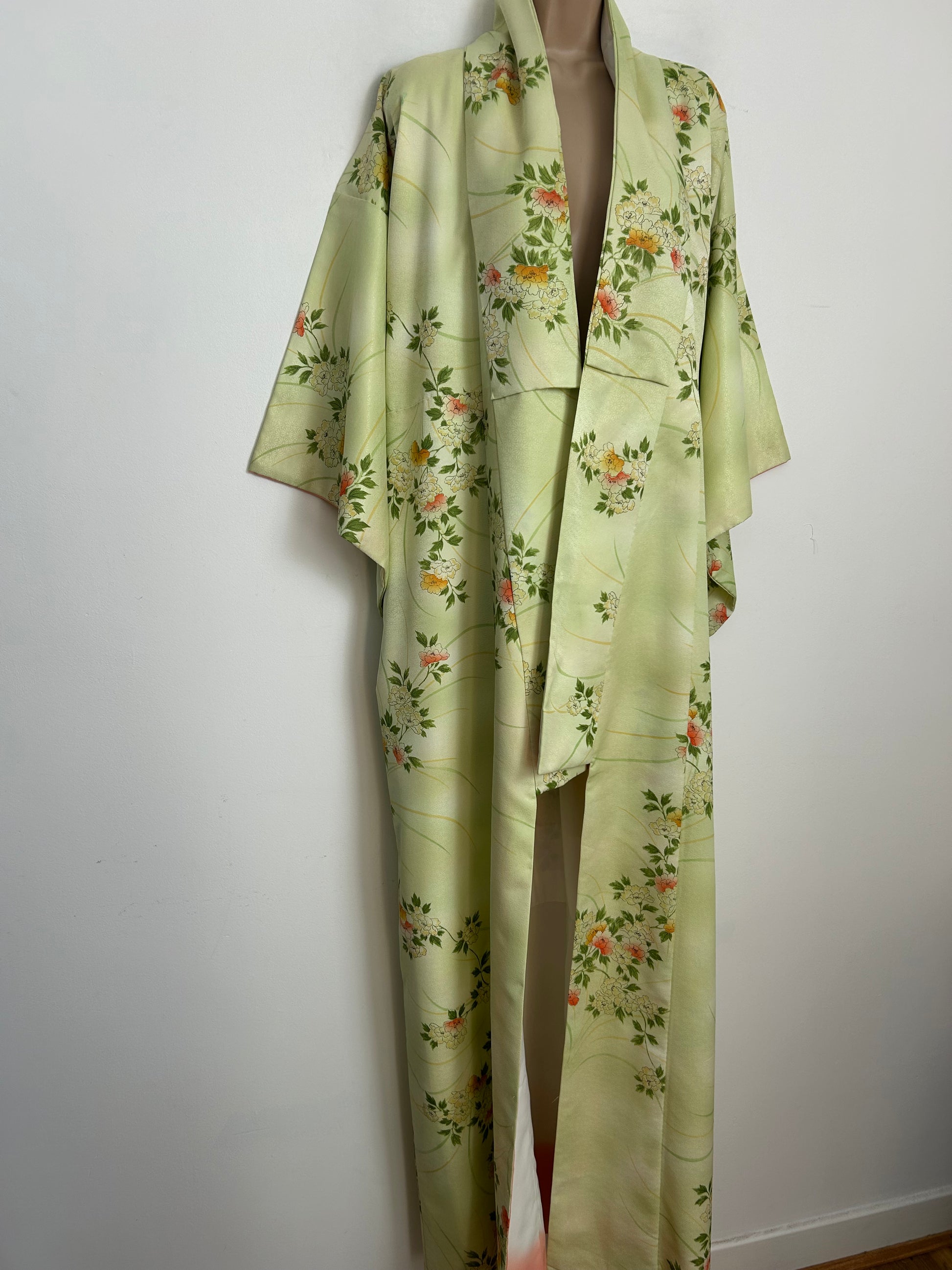 Vintage Traditional Authentic Up To Size 16 Beautiful Pale Green & Orange Floral Print Japanese Kimono