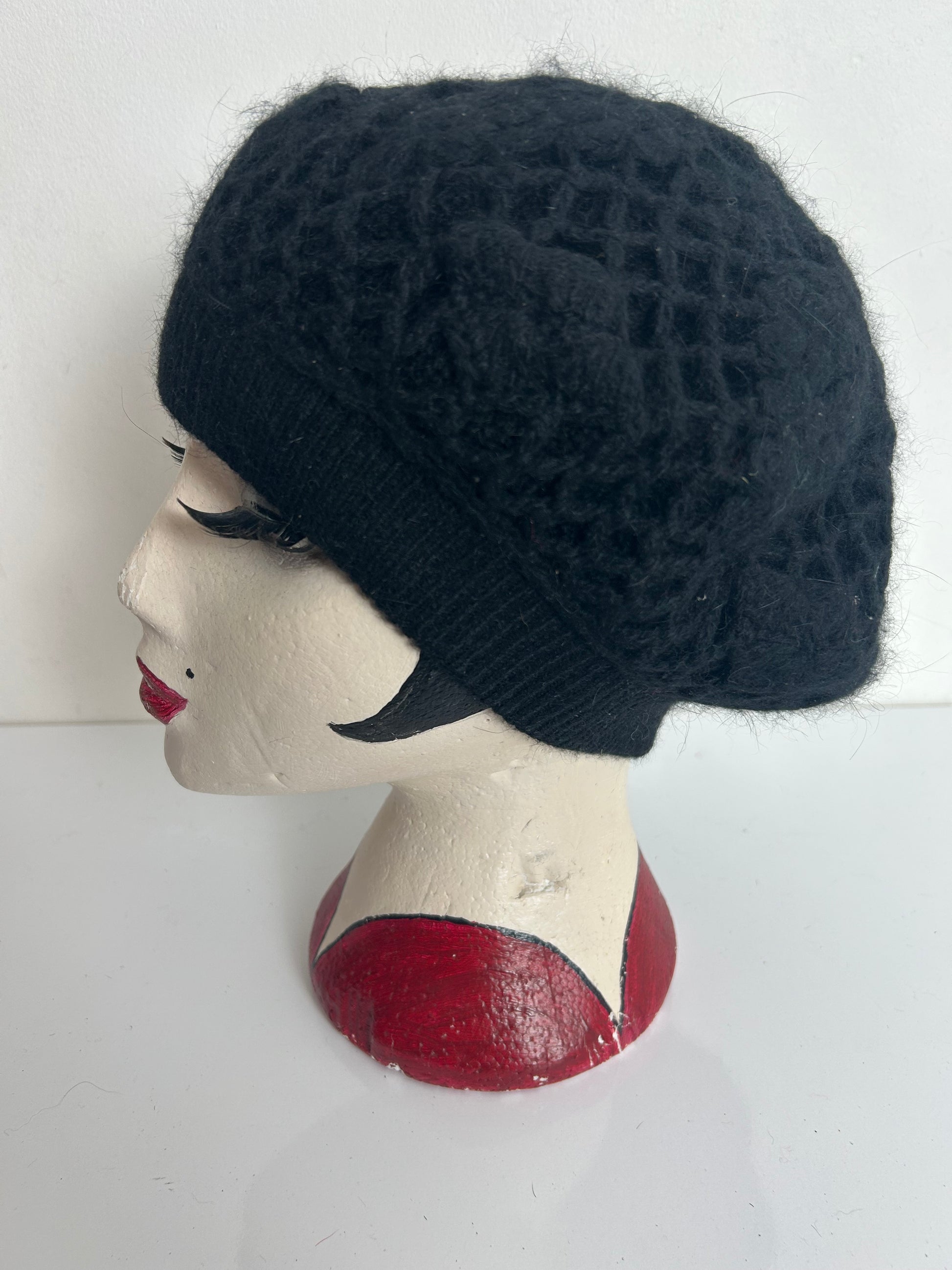 Vintage Black Crochet Wool & Angora Mix Beret Hat