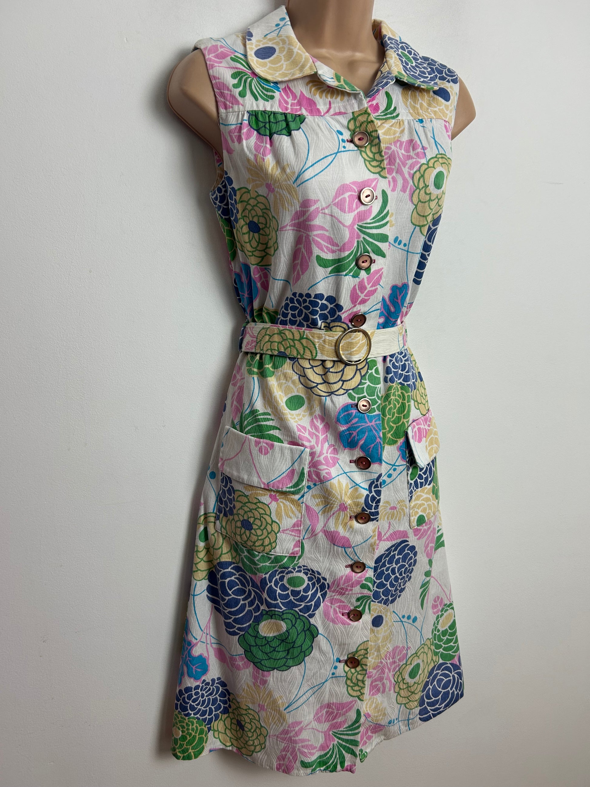 This cute vintage mod dress is made from 100% cotton in white pink blue beige & green floral print.
