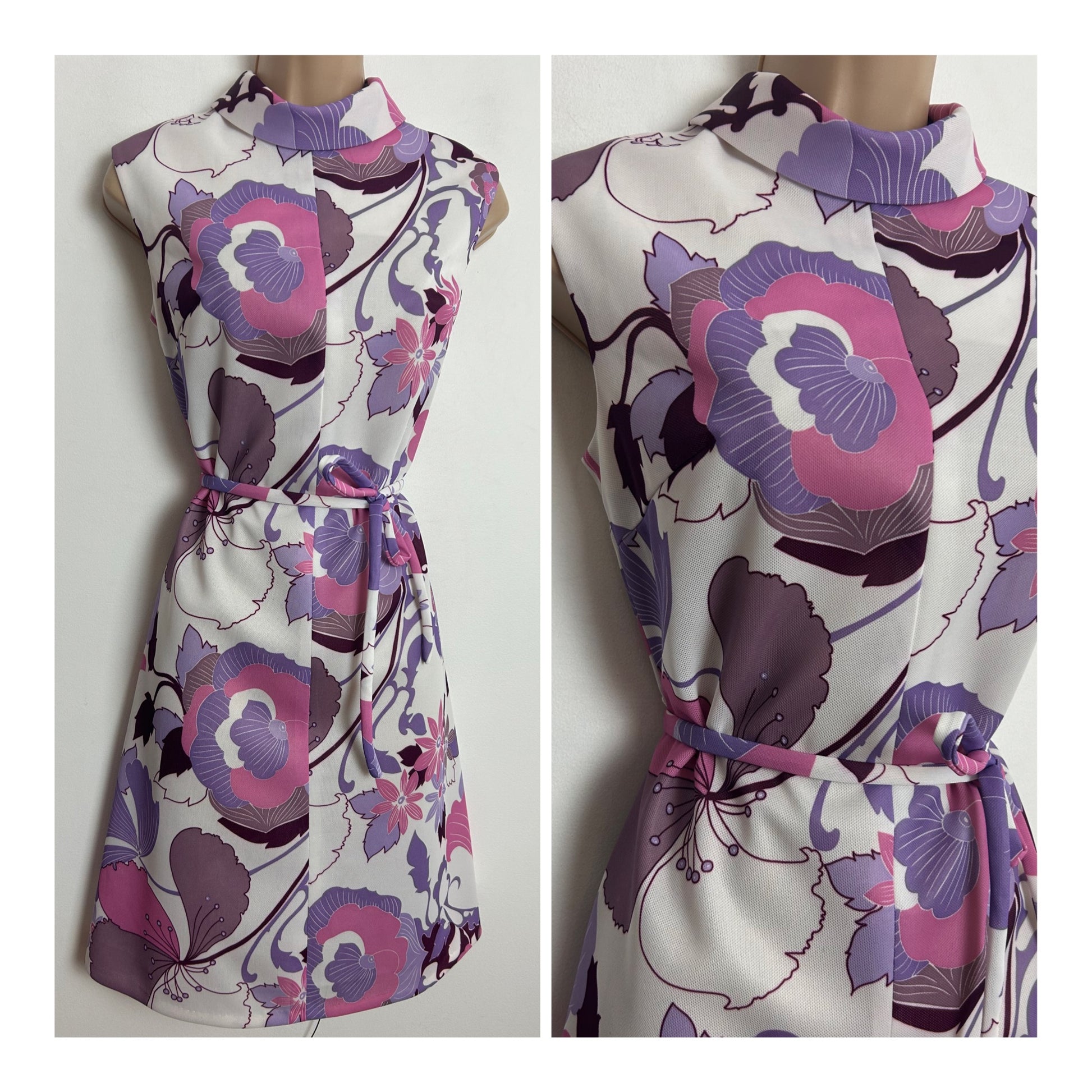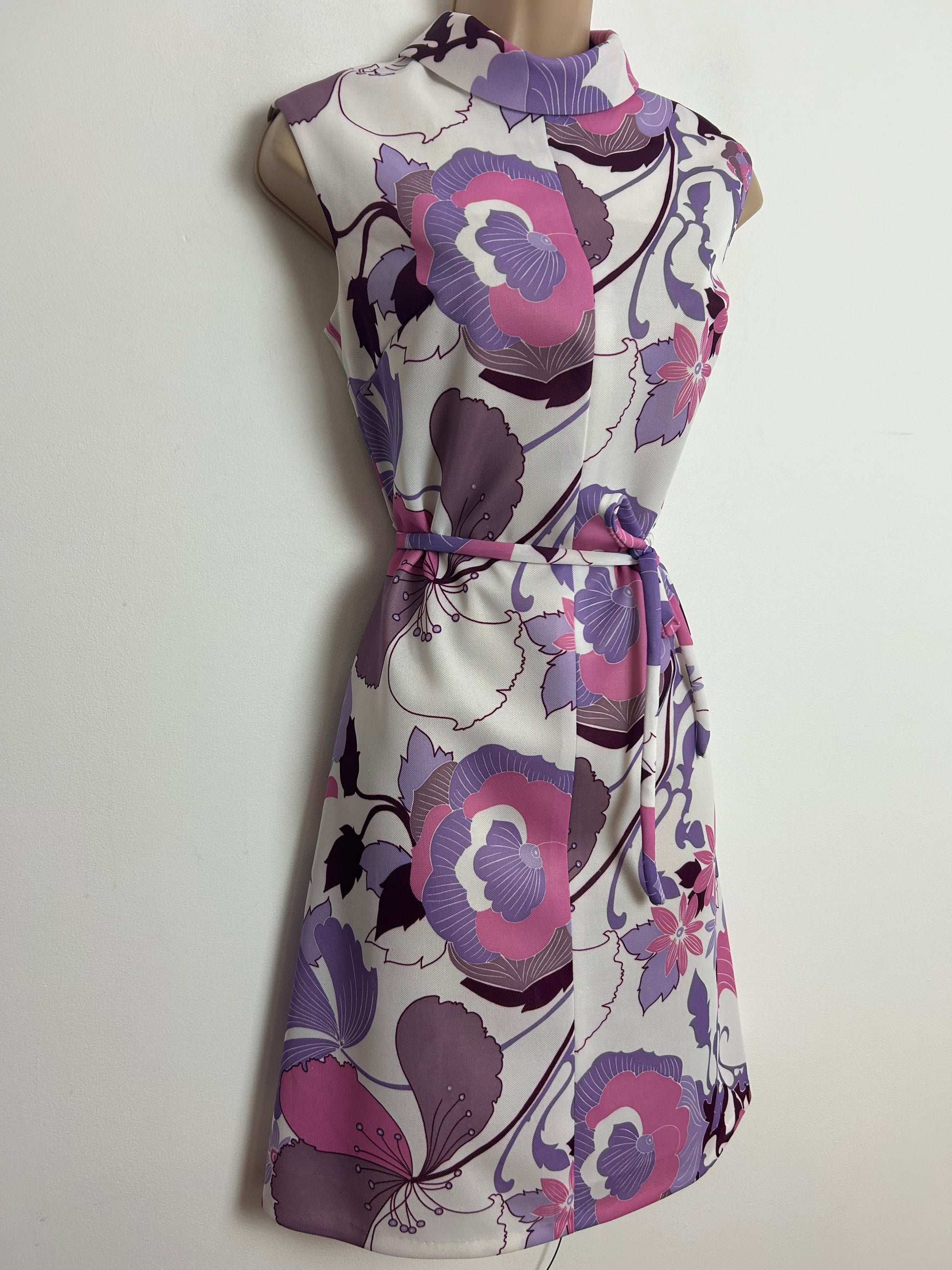 Vintage Early 1970s ST MICHAEL Size 10 White Pink Lilac & Plum Floral Print Sleeveless Belted Mod Dress